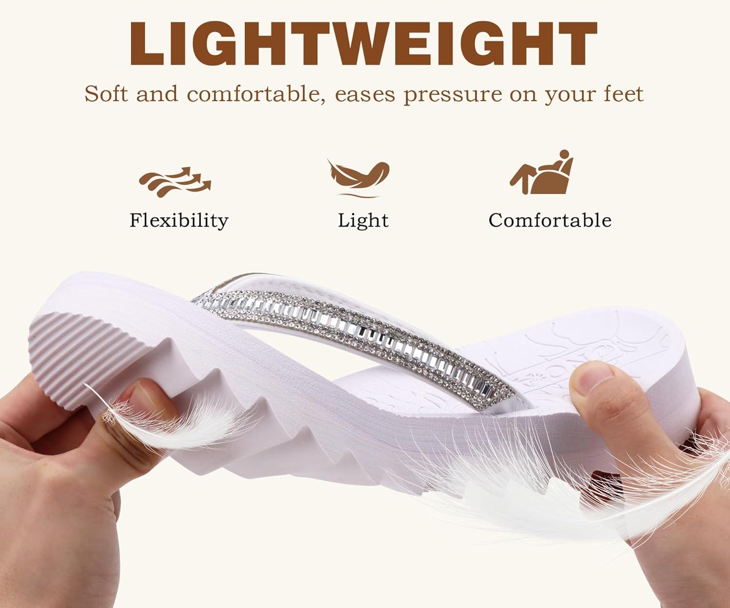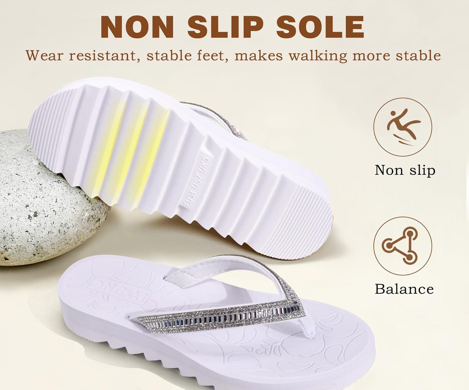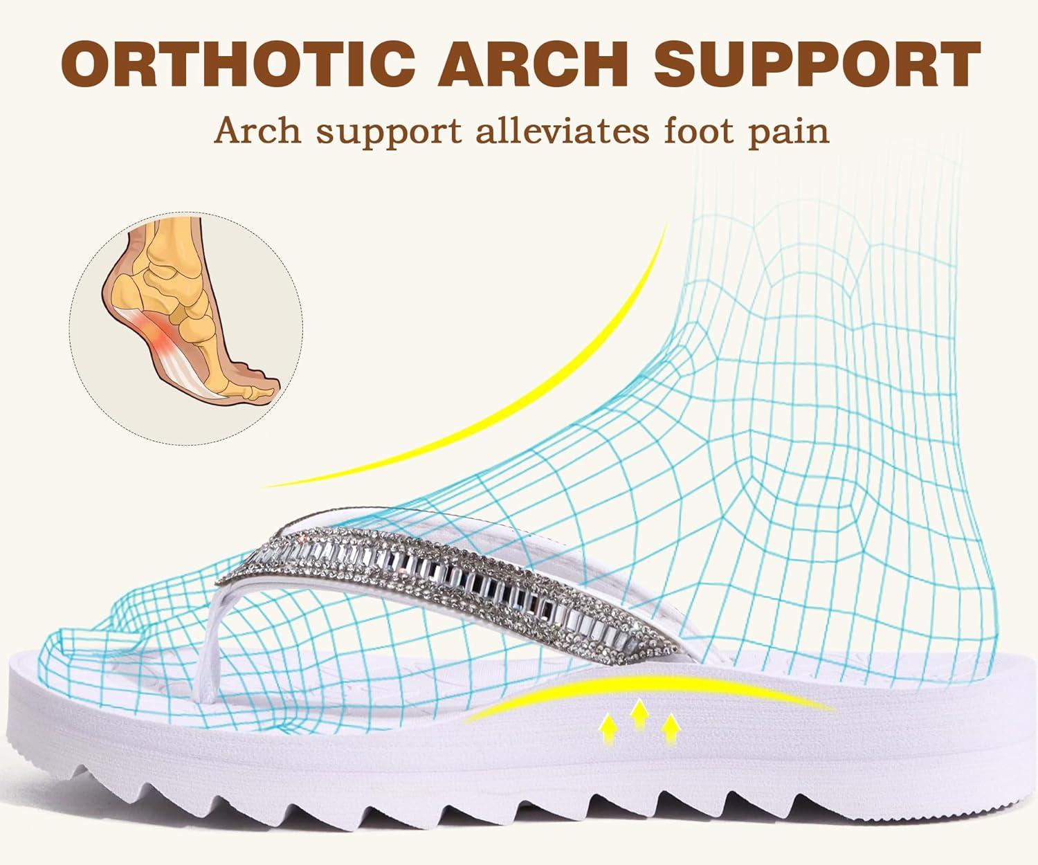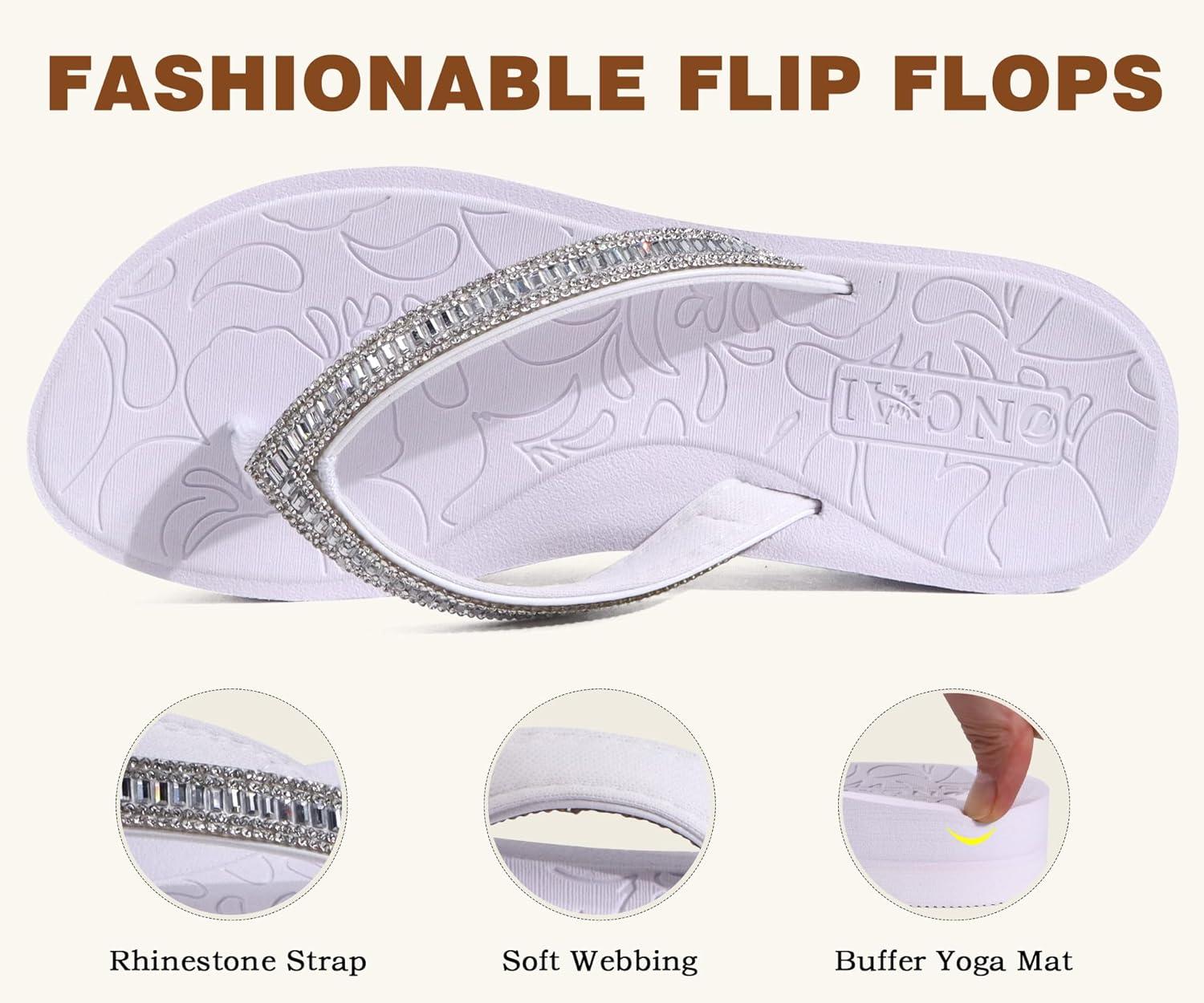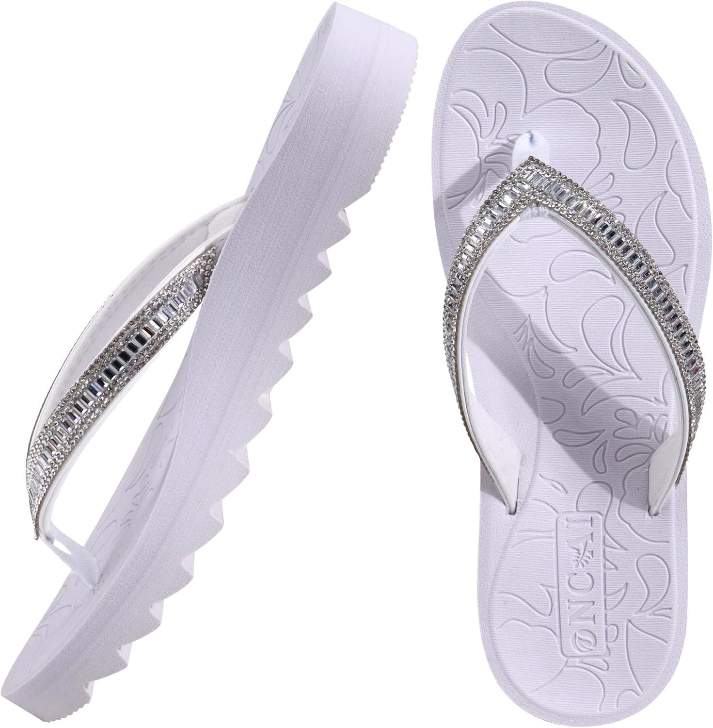 ONCAI Flip Flops for Women, Beach Thong Sandals Womens with Arch Support, Dressy Rhinestone Comfortable Yoga Mat and Non Slip Rubber Soles for Summer US Size 5-11(Silvery White)