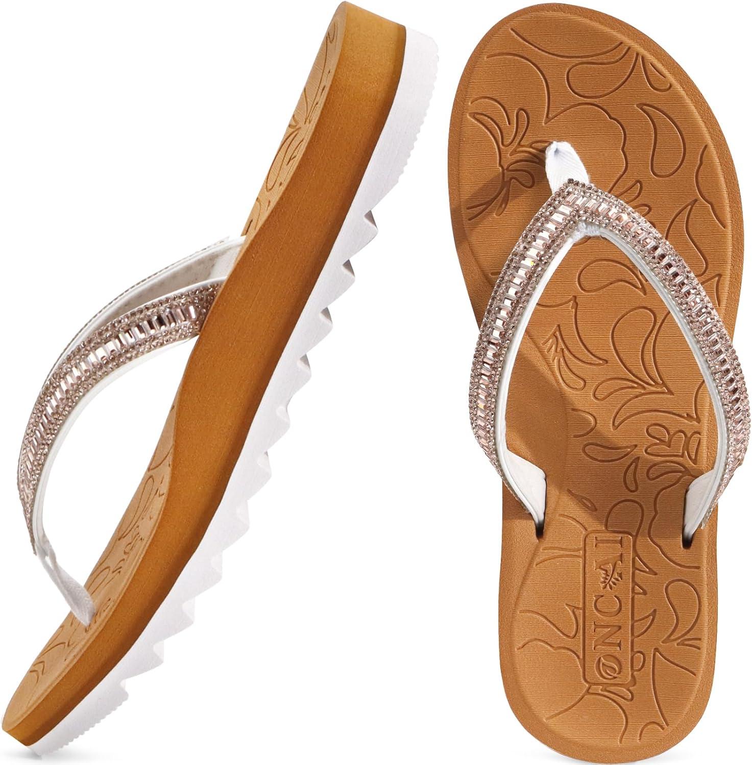 ONCAI Flip Flops for Women, Beach Thong Sandals Womens with Arch Support, Dressy Rhinestone Comfortable Yoga Mat and Non Slip Rubber Soles for Summer US Size 5-11(White/Khaki)