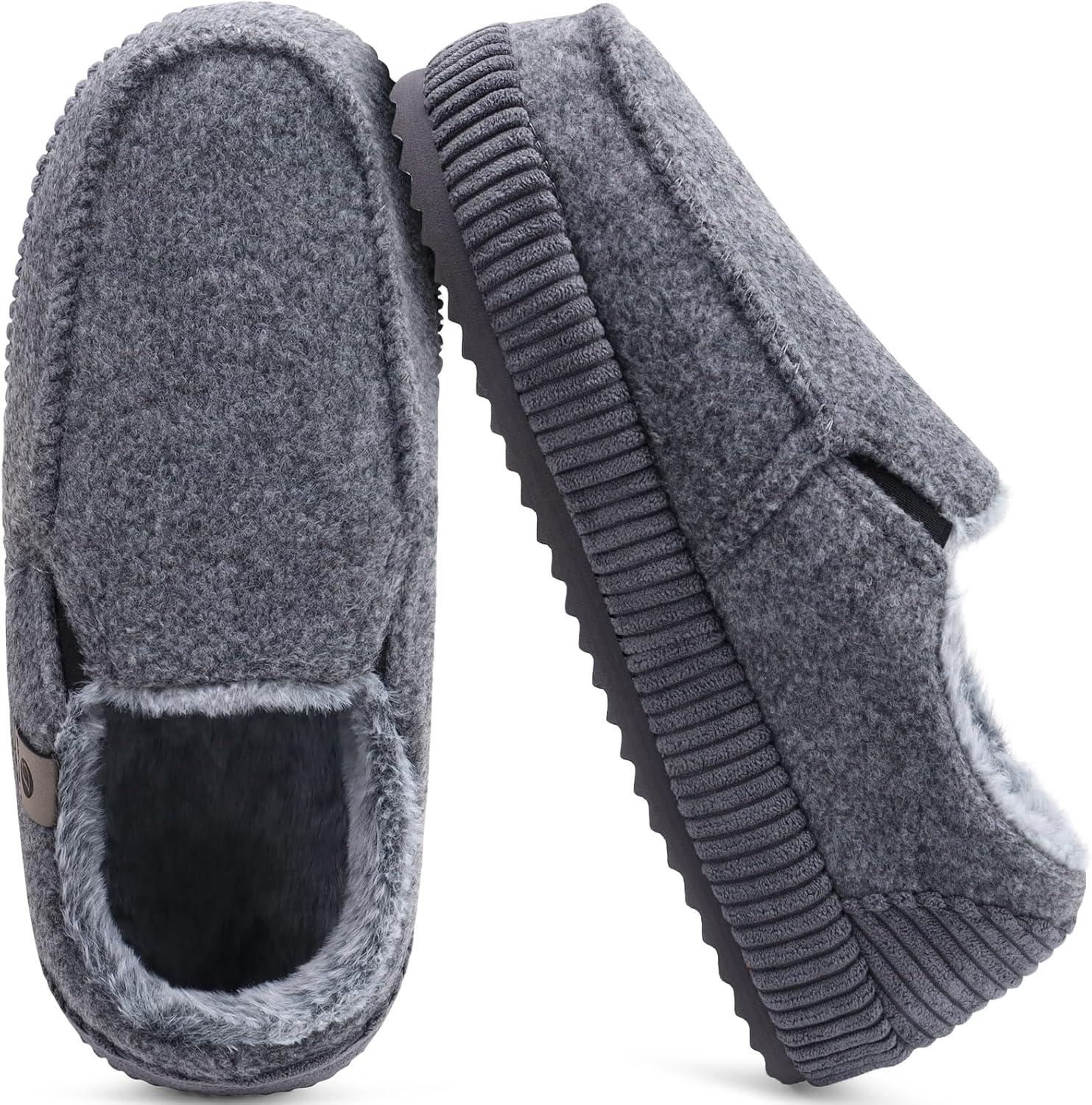 ONCAI Mens Clog Slippers with Arch Support Stripe Faux Fur Cotton-Blend High-Density Memory Foam Warm House Slippers Slip-on Indoor Outdoor Rubber Sole Size 7-16(Moccasins Grey)