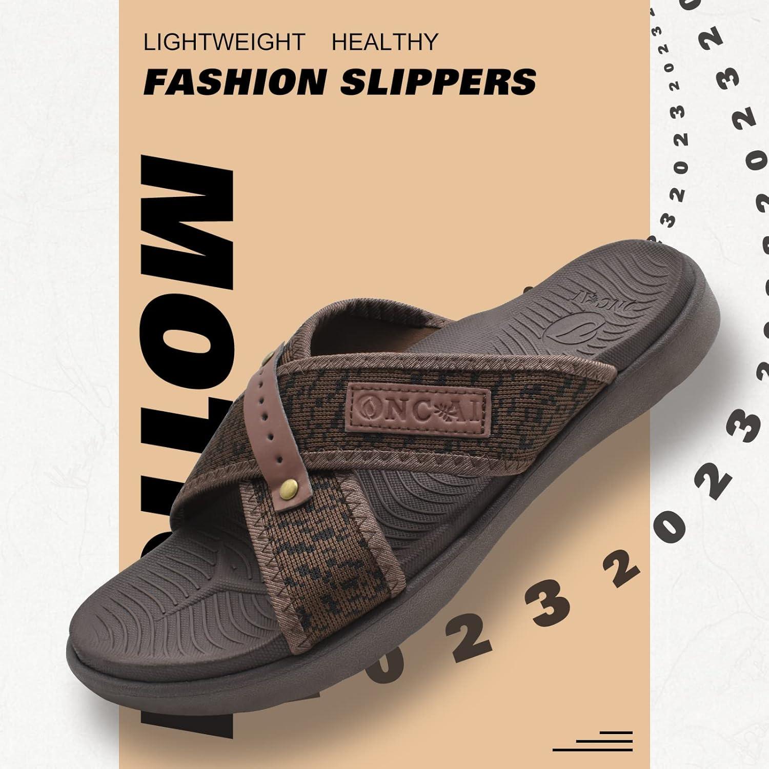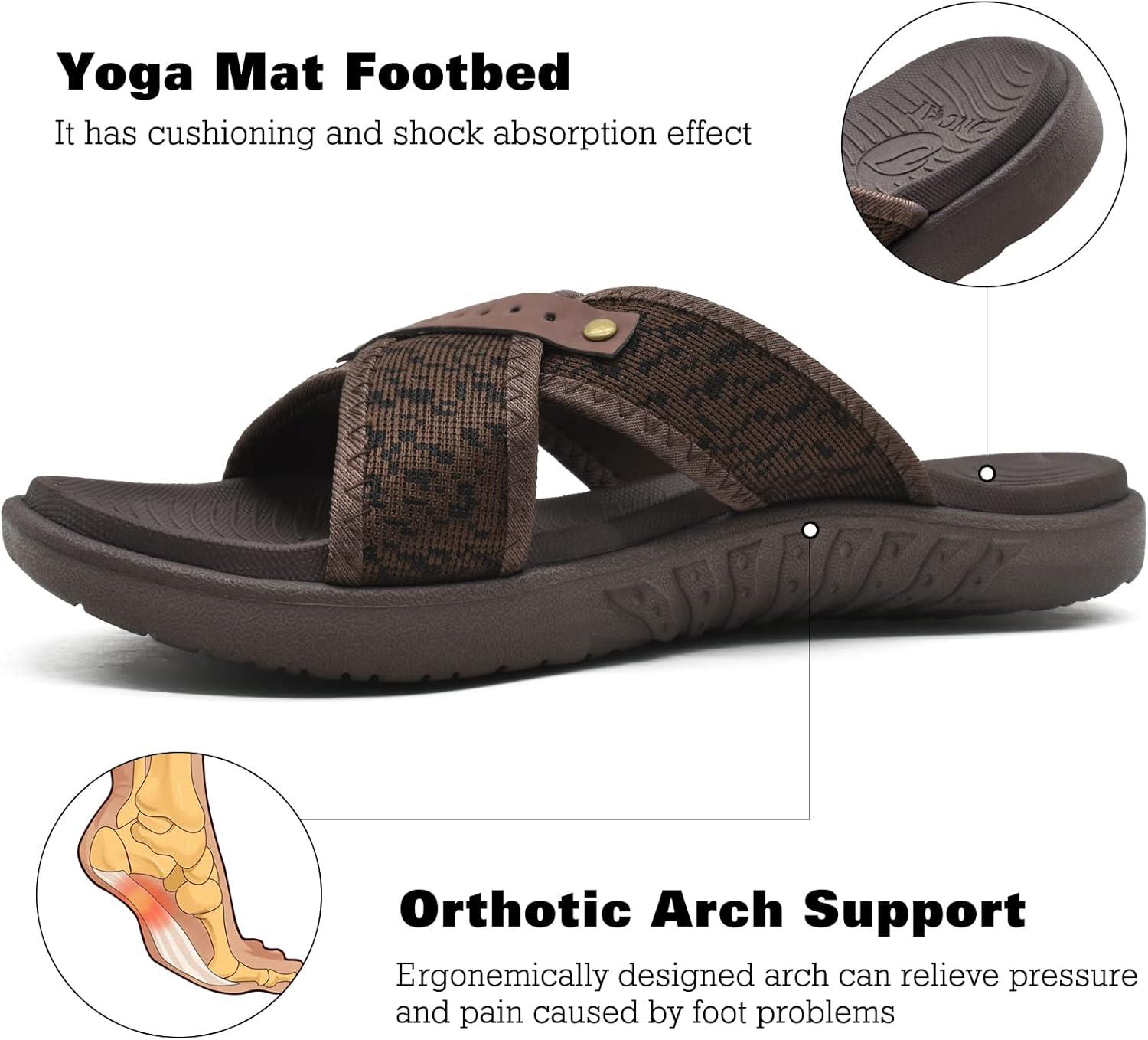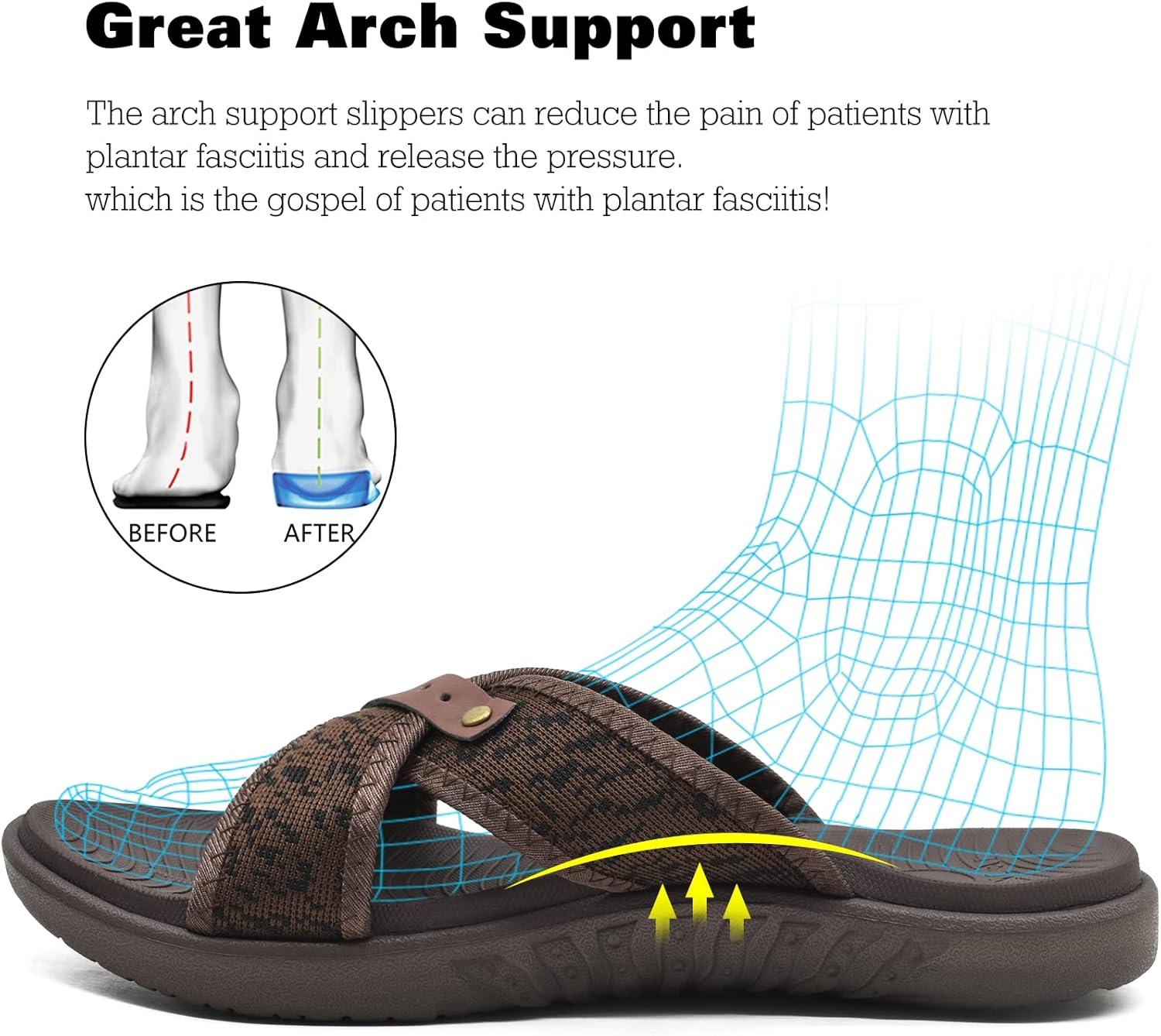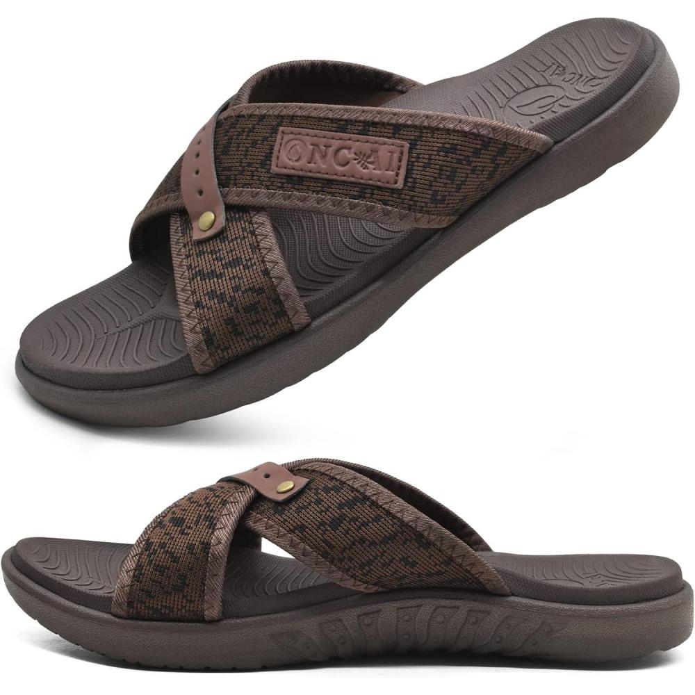 ONCAI Mens Criss Cross Sandals,Arch Support Recovery Sport Slippers Slides with Plantar Fasciitis Orthotic Footbed(Brown)