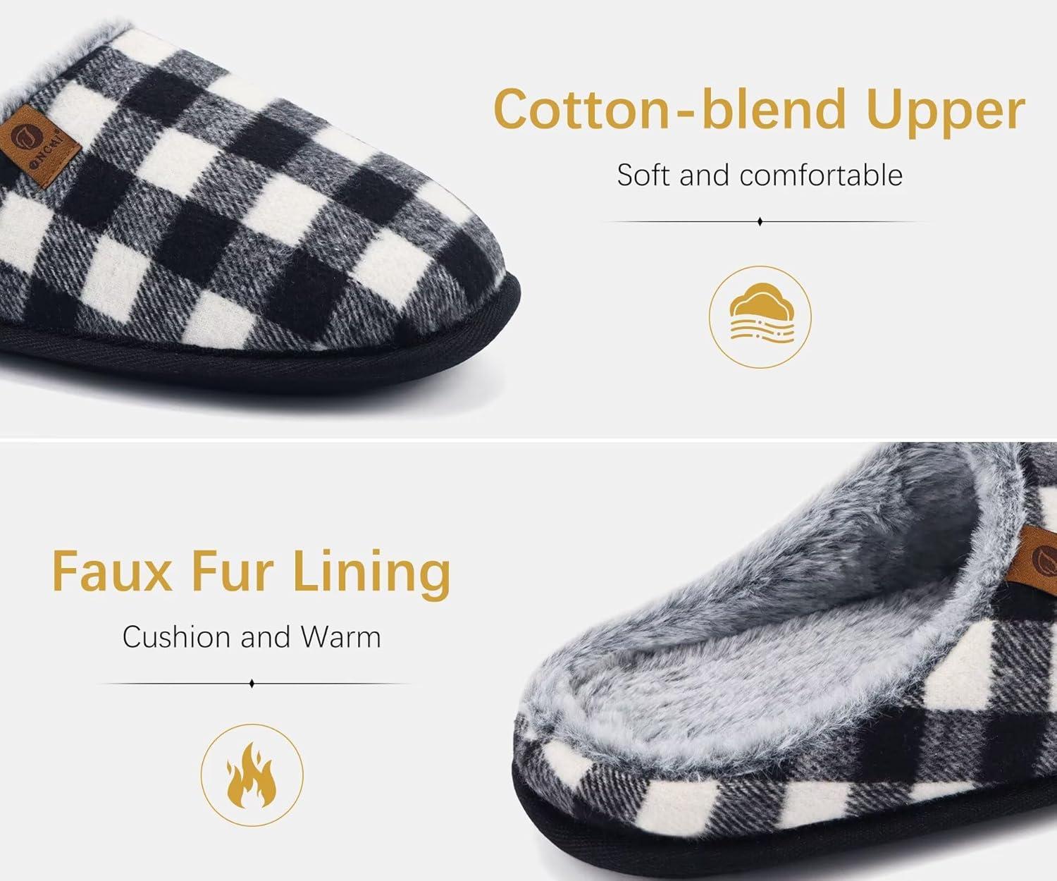 ONCAI Men’s House Slippers Memory Foam Slip-On Warm Cozy Scuff Home Bedroom Shoes with Indoor/Outdoor Rubber Soles US Size 7-15(Plush Black/White)