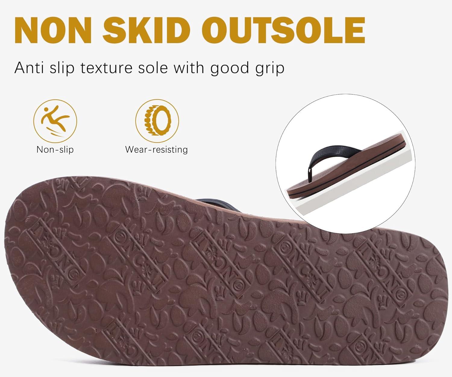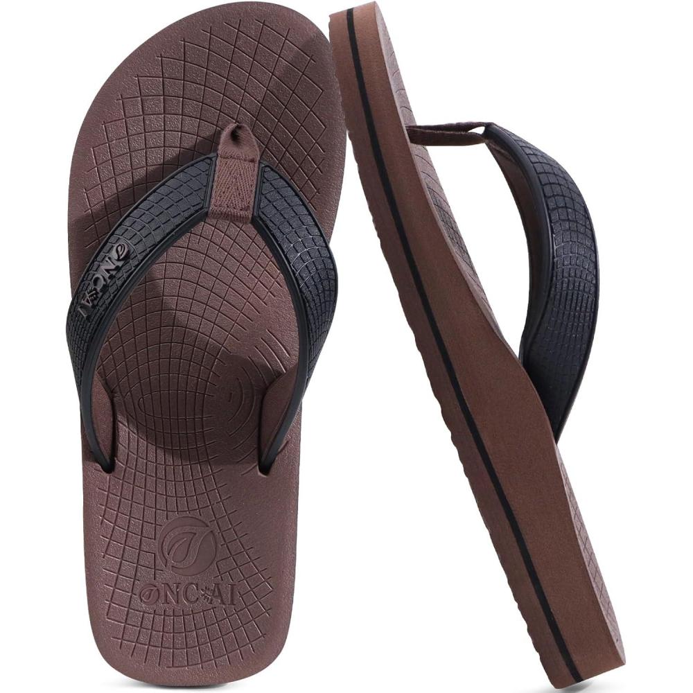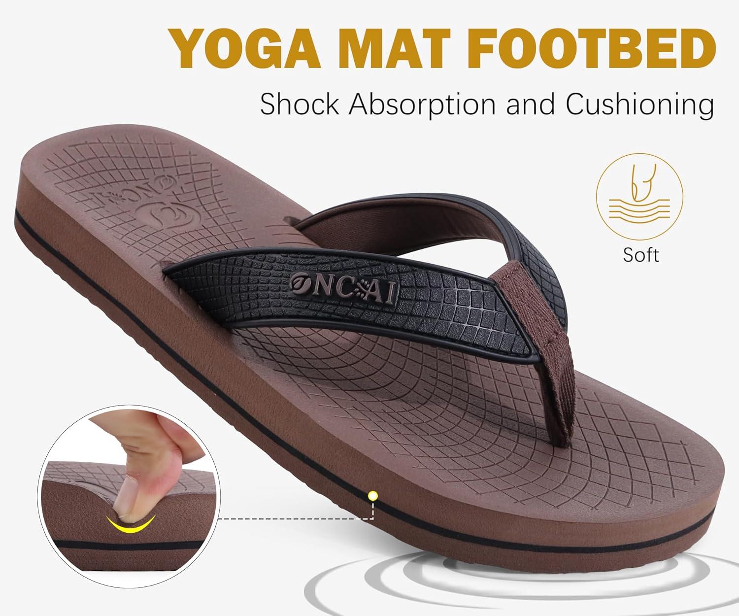ONCAI Men’s Rubber Flip Flops Trendy Summer Beach Pool Shower Sandals with Yoga Mat Non-slip Outdoor Cushion Soles(Black/Brown)