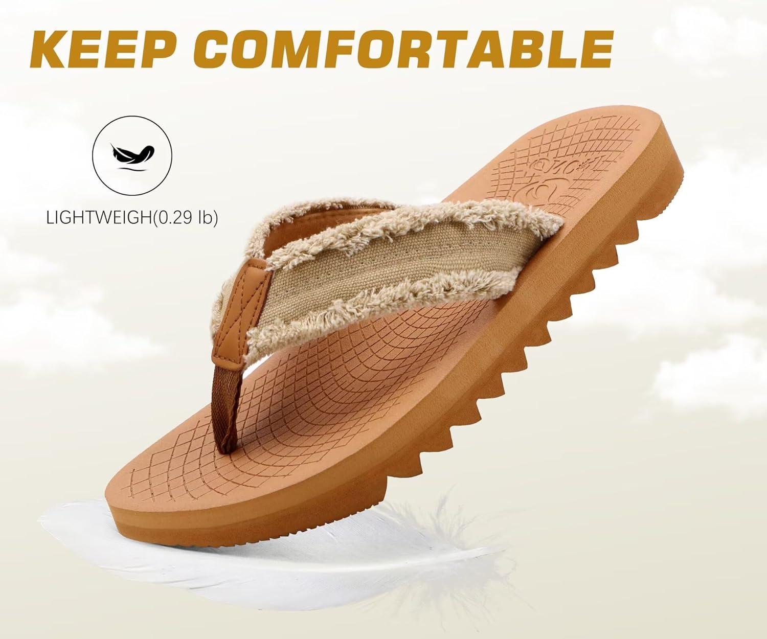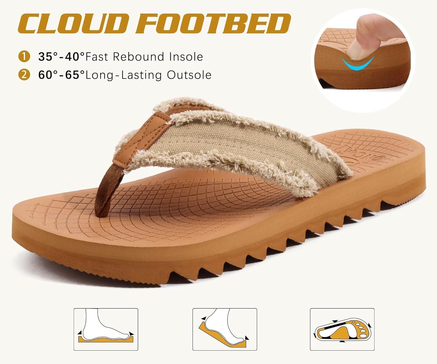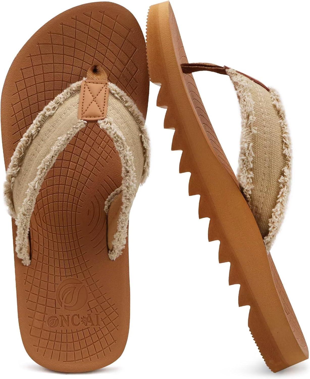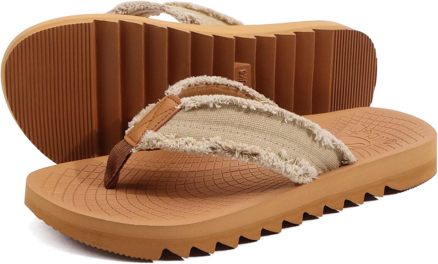 ONCAI Men’s Rubber Flip Flops Trendy Summer Beach Pool Shower Sandals with Yoga Mat Non-slip Outdoor Cushion Soles(Khaki-vacations)