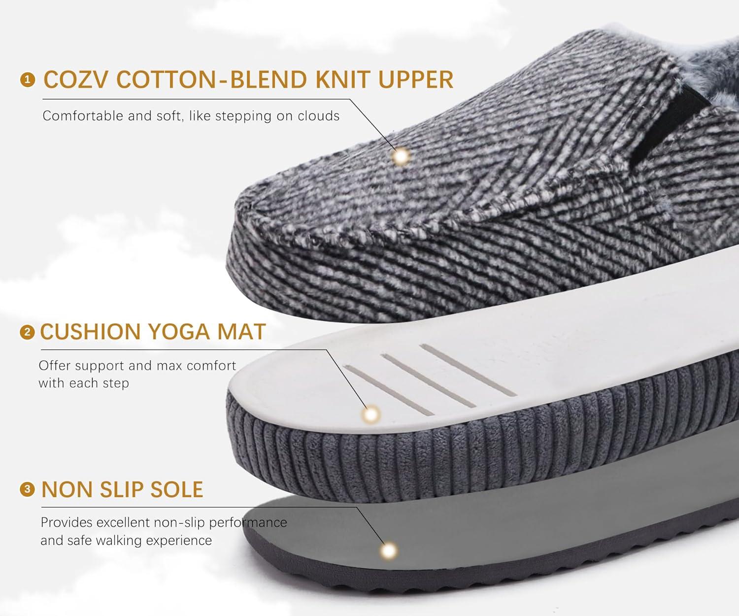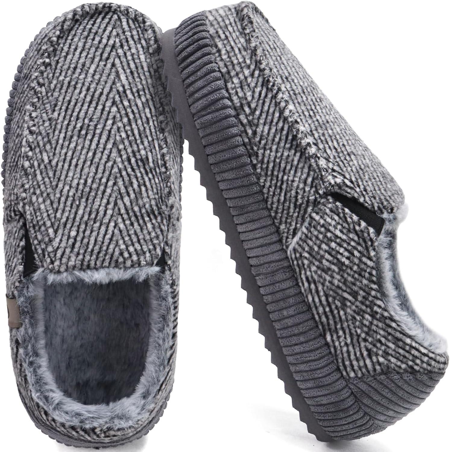ONCAI Men’s Slippers Cotton-Blend Moccasins Warm Closed Back Corduroy House Slippers with High-Density Felt Fuzzy Indoor Outdoor Comfortale Yoga Mat Rubber Soles US Size 7-15(Moccasins Grey/White)