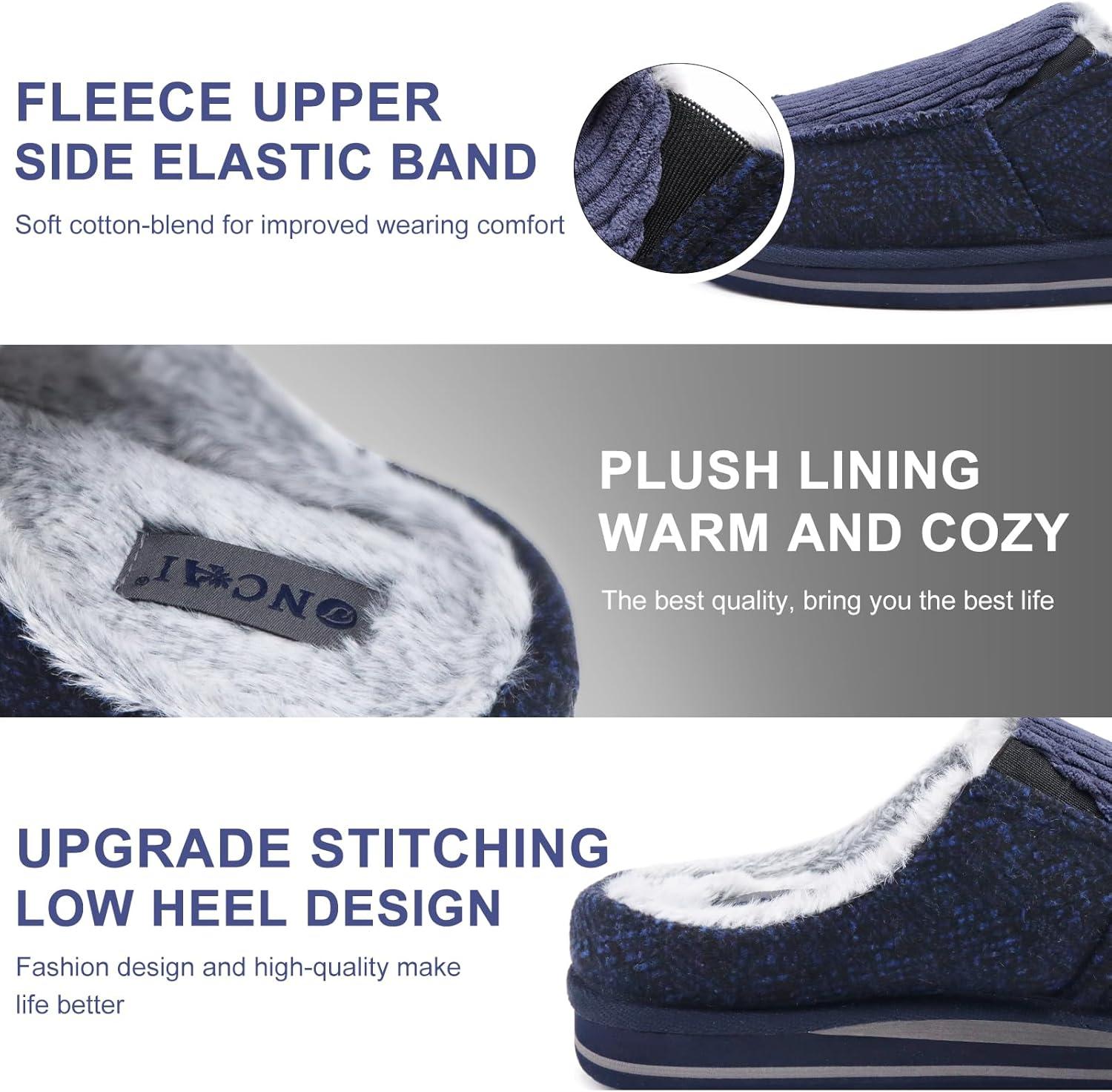 ONCAI Mens Slippers with Arch Support Stripe Faux Fur Cotton-Blend High-Density Memory Foam Warm House Slippers for man Slip-on Indoor Outdoor Rubber Sole Size 7-16(Corduroy Blue)