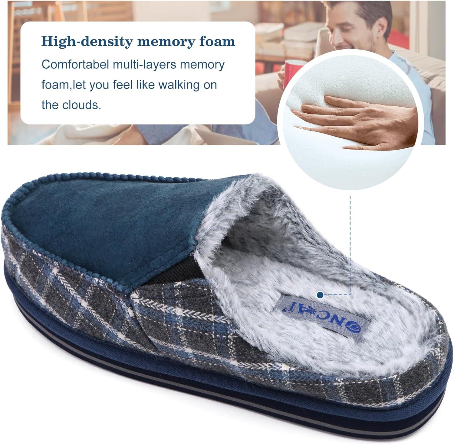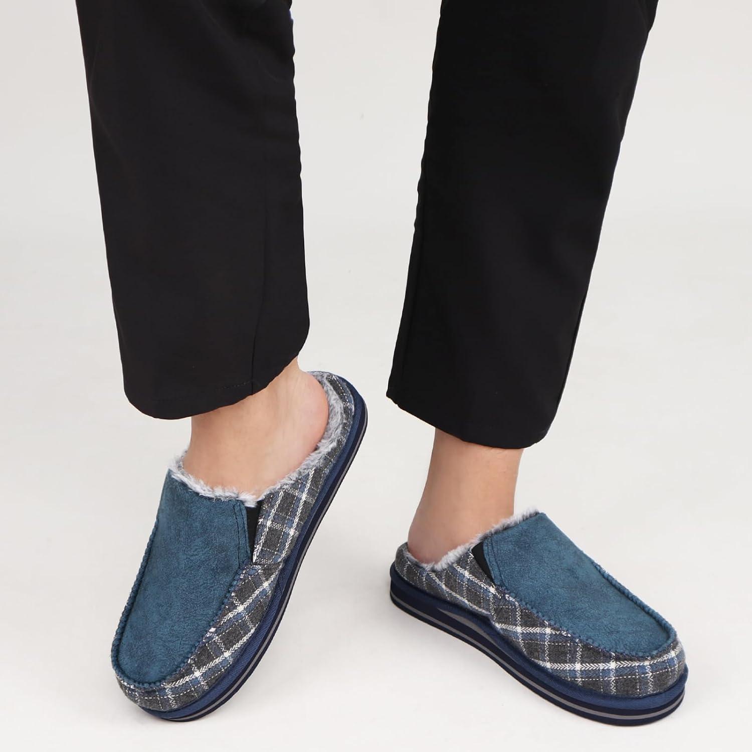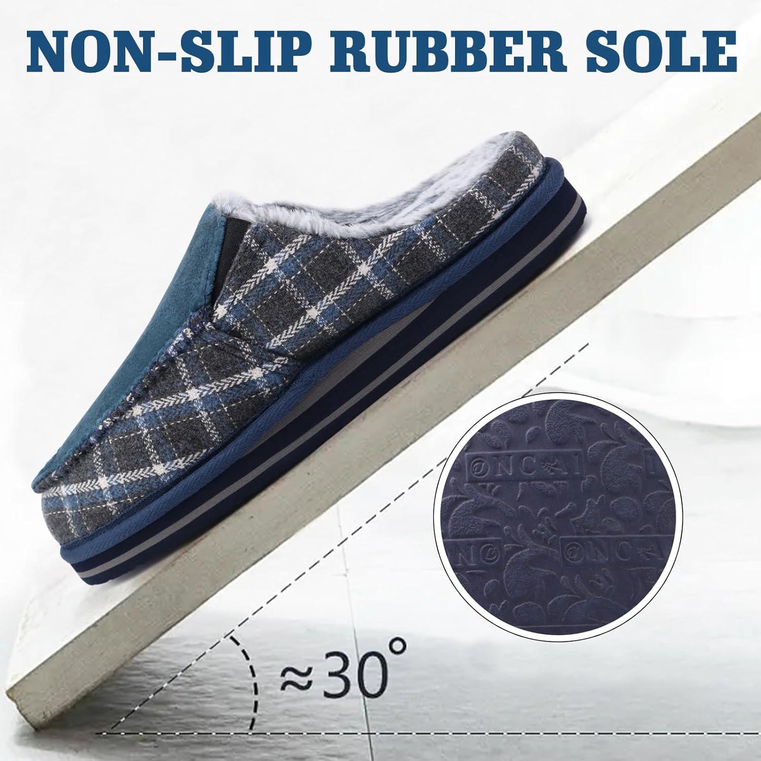 ONCAI Mens Slippers with Arch Support Stripe Faux Fur Cotton-Blend High-Density Memory Foam Warm House Slippers for man Slip-on Indoor Outdoor Rubber Sole Size 7-16(Fur Plaid Blue)