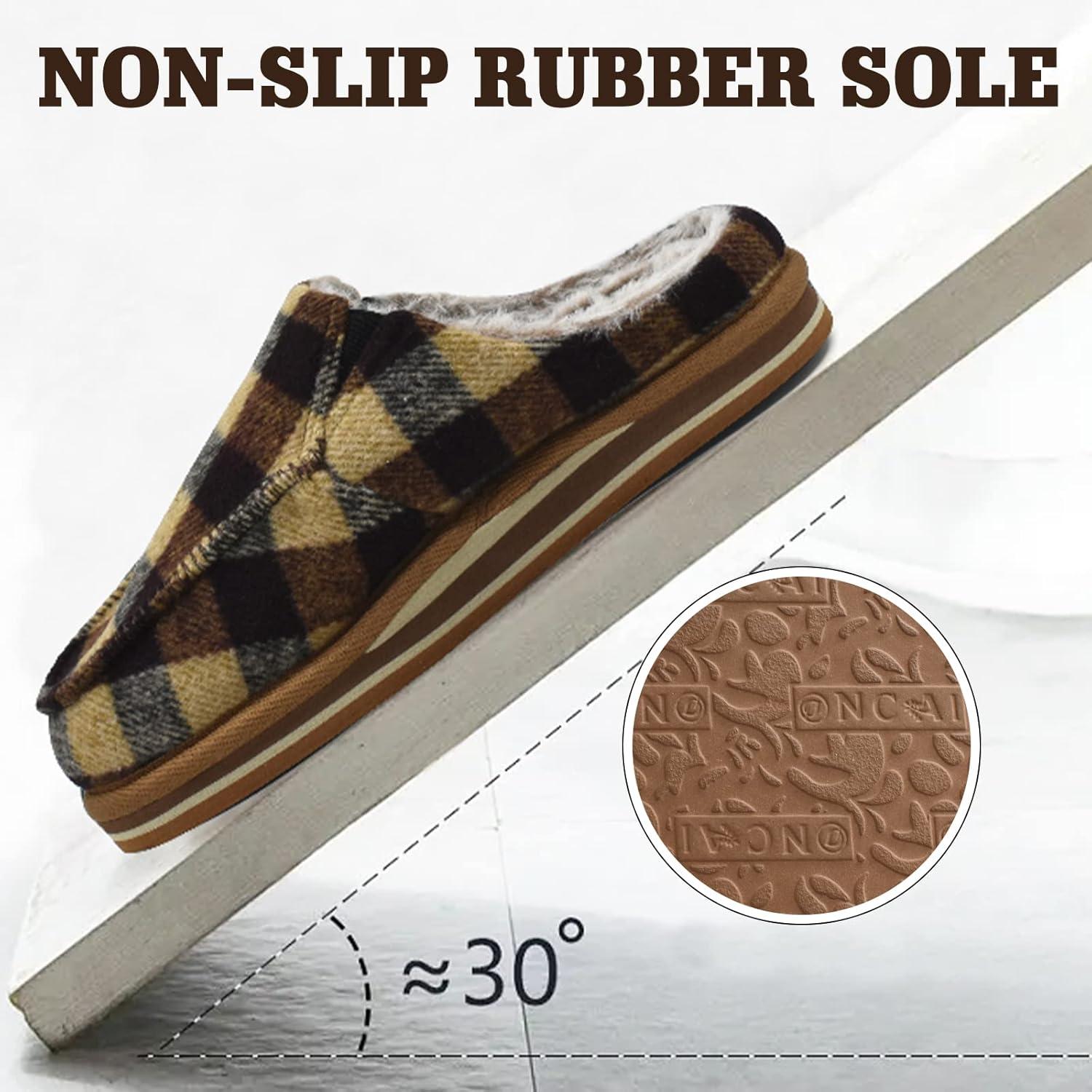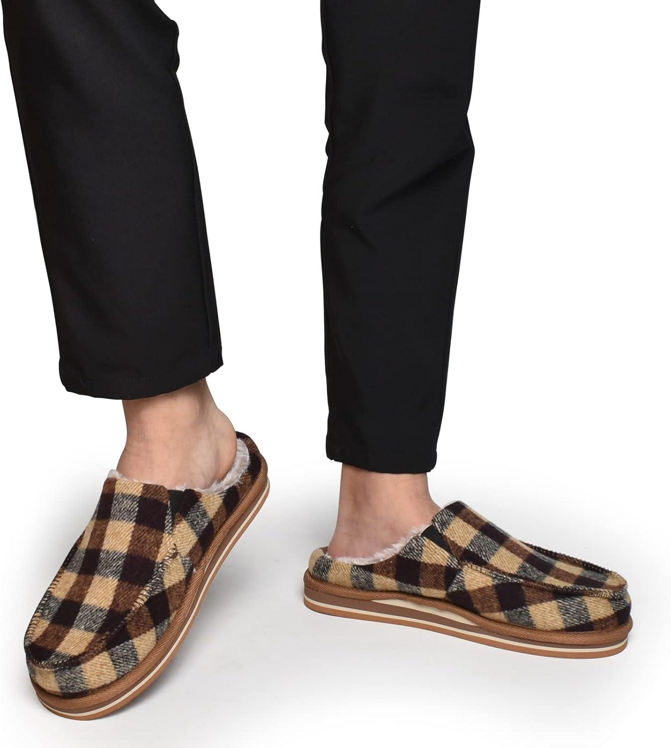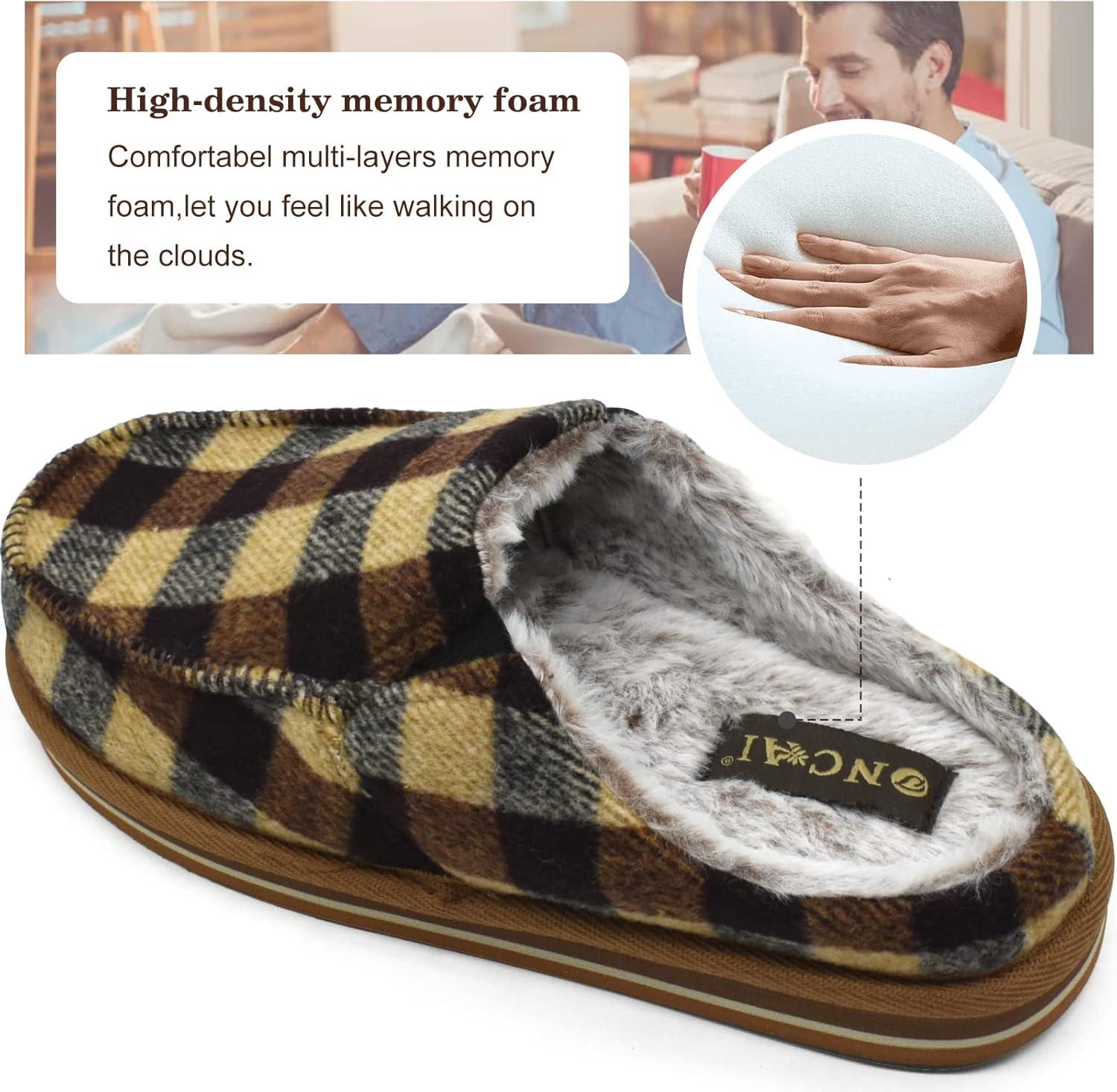 ONCAI Mens Slippers with Arch Support Stripe Faux Fur Cotton-Blend High-Density Memory Foam Warm House Slippers for man Slip-on Indoor Outdoor Rubber Sole Size 7-16(Plaid Khaki)