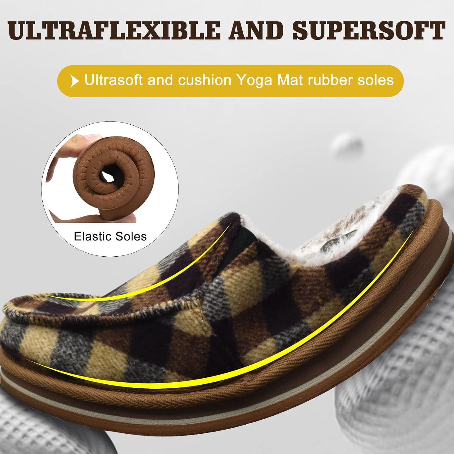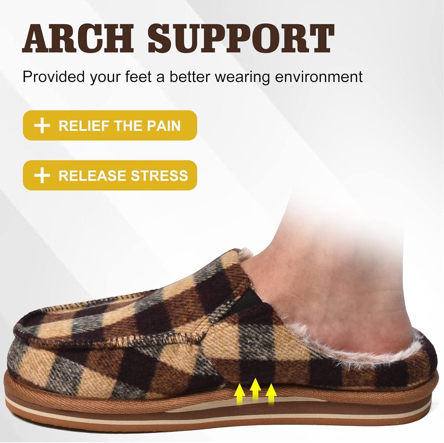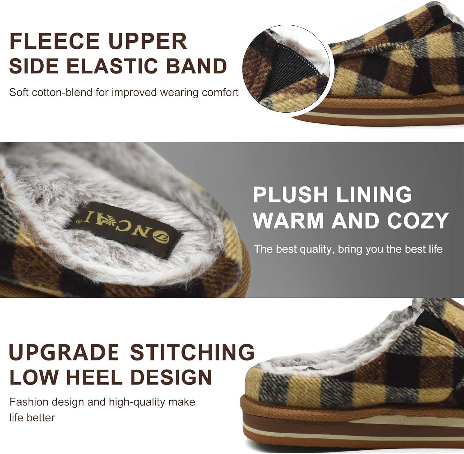 ONCAI Mens Slippers with Arch Support Stripe Faux Fur Cotton-Blend High-Density Memory Foam Warm House Slippers for man Slip-on Indoor Outdoor Rubber Sole Size 7-16(Plaid Khaki)