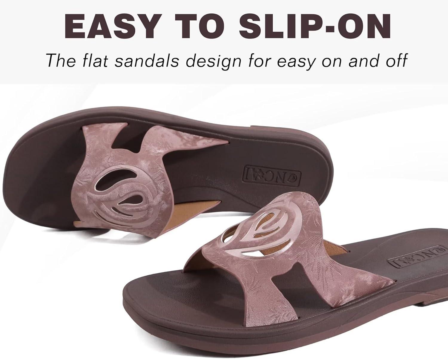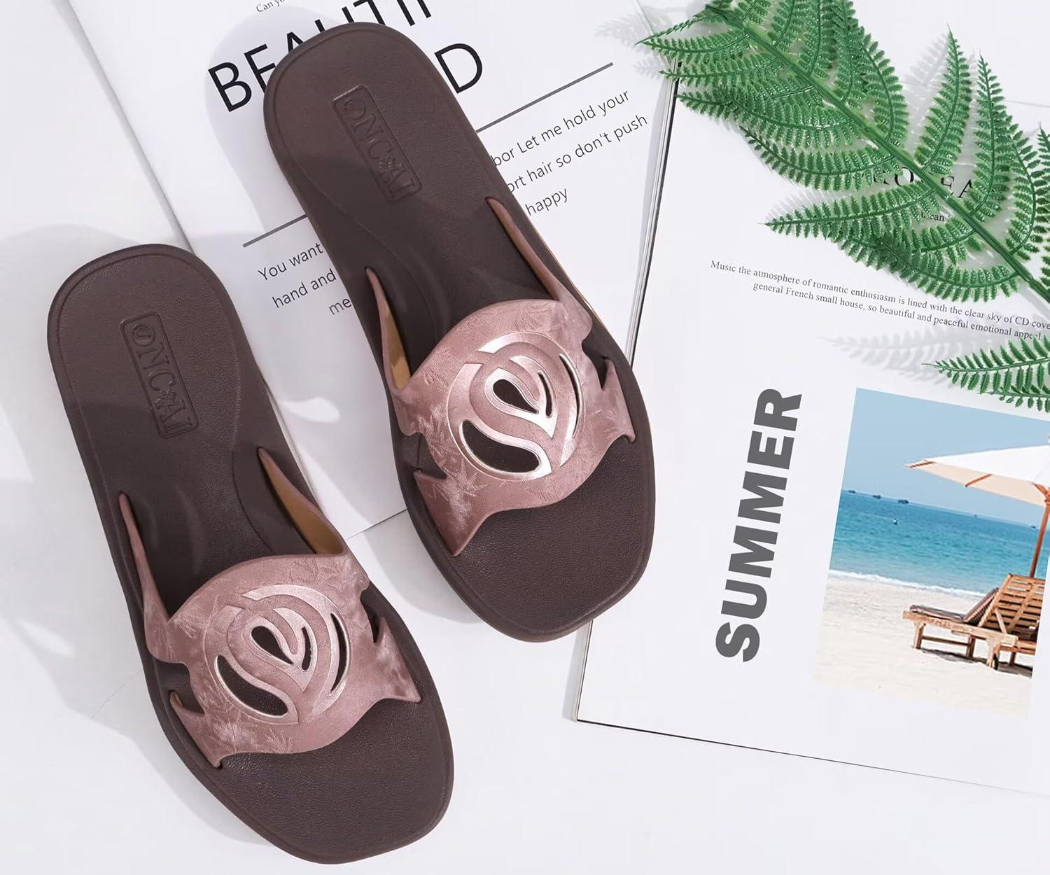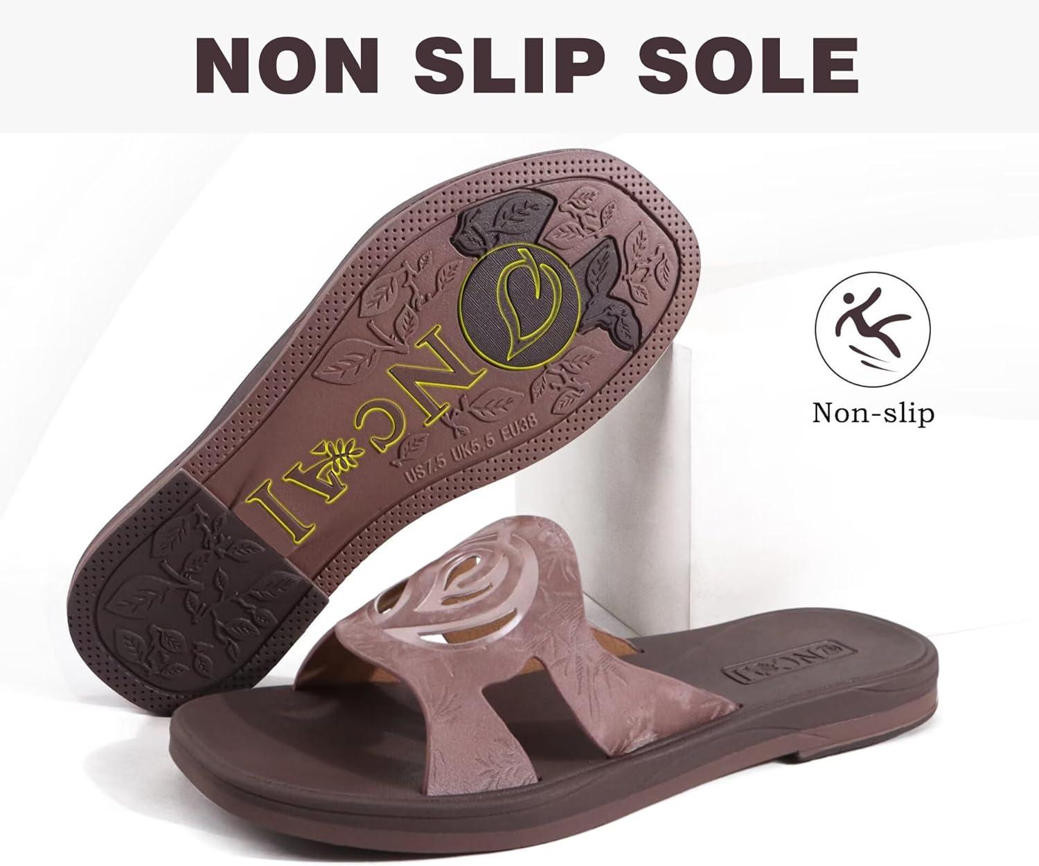 ONCAI Slides for Womens,Flat Dressy Square Toe Summer Beach Sandals for Woman with Comfortable Non-slip Rubber Soles Size 6-11(All-brown)