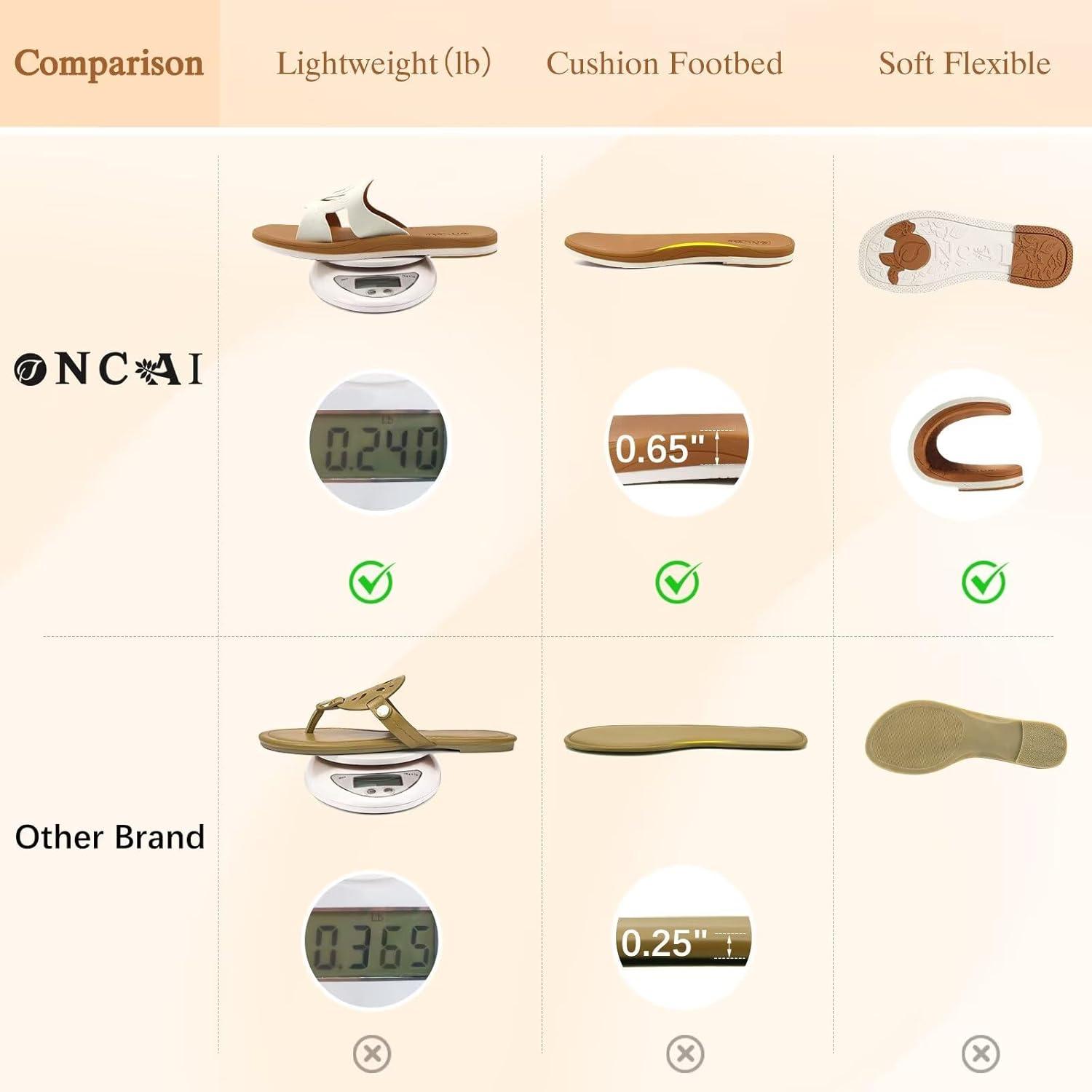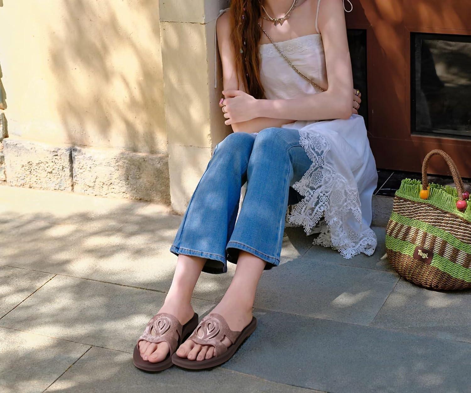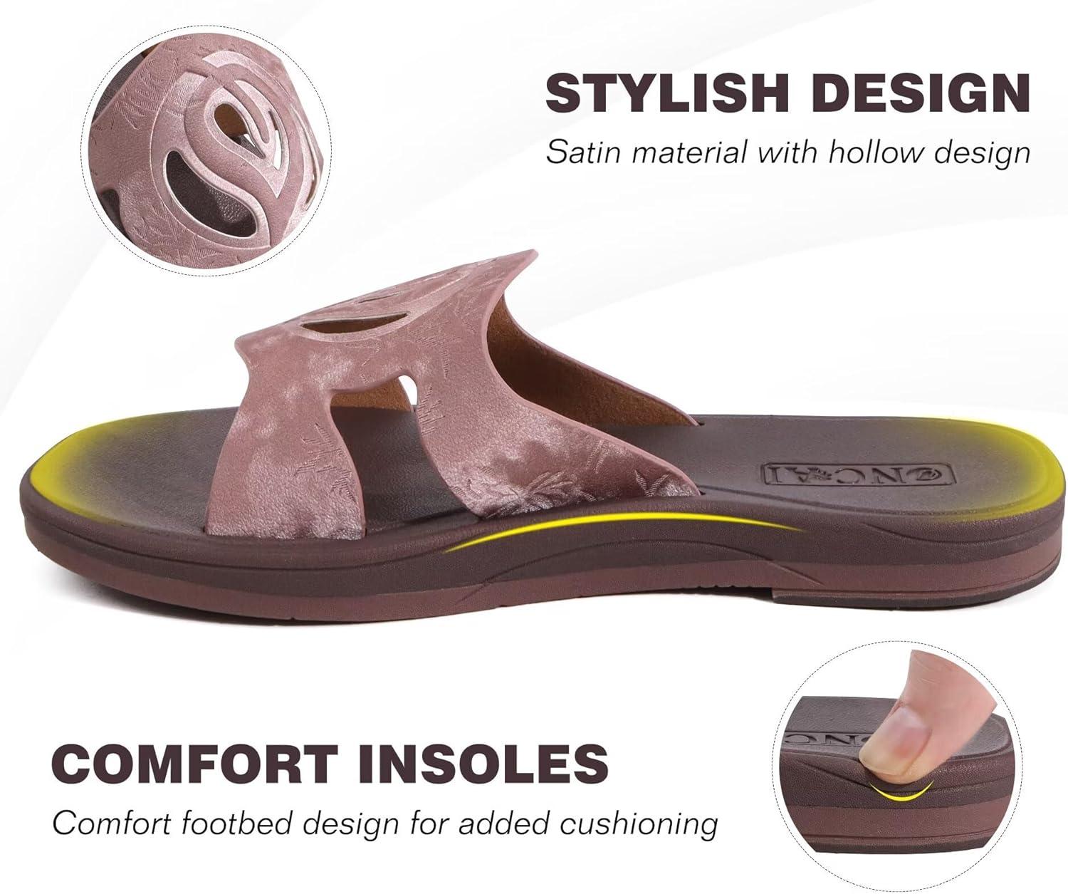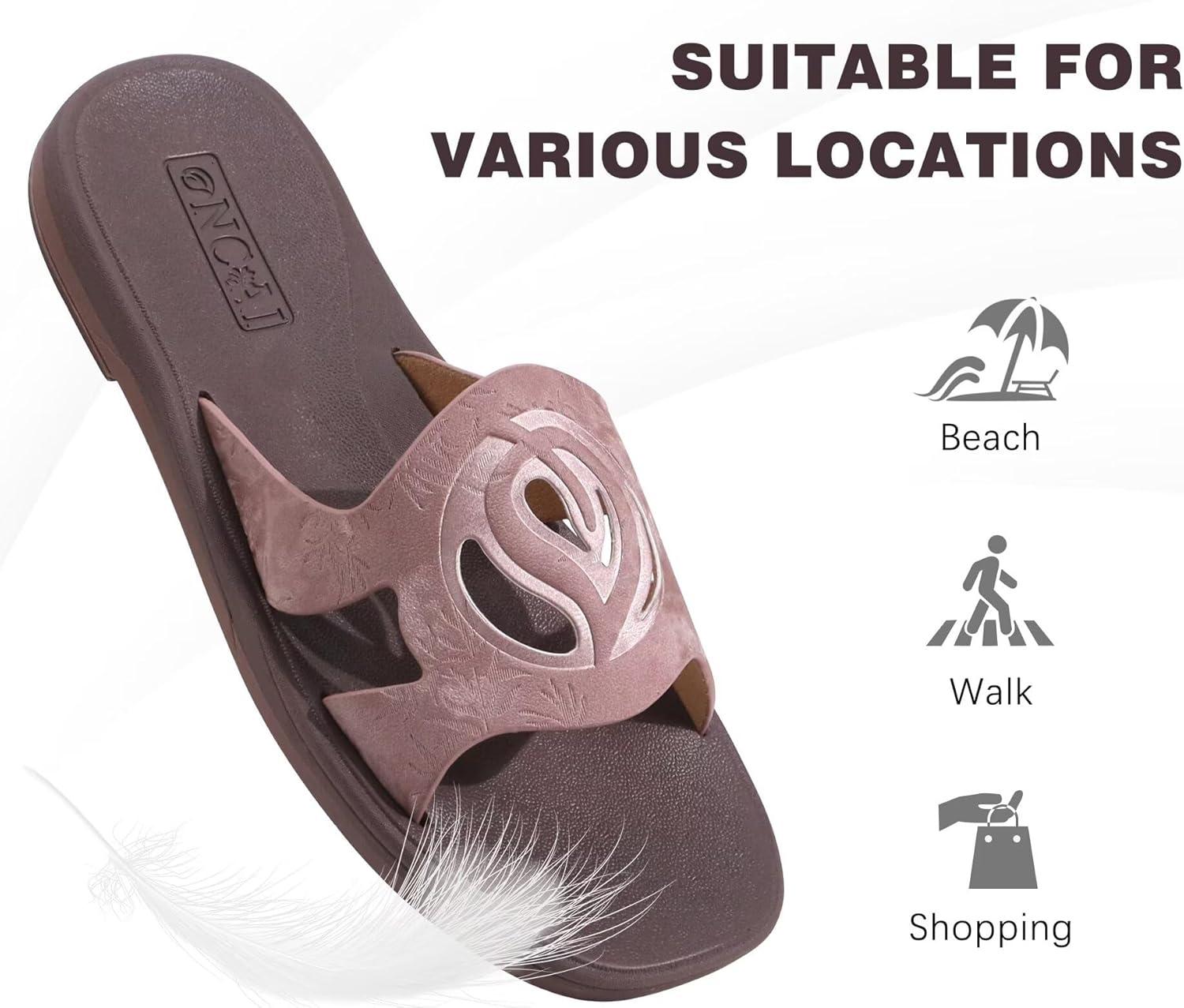 ONCAI Slides for Womens,Flat Dressy Square Toe Summer Beach Sandals for Woman with Comfortable Non-slip Rubber Soles Size 6-11(All-brown)