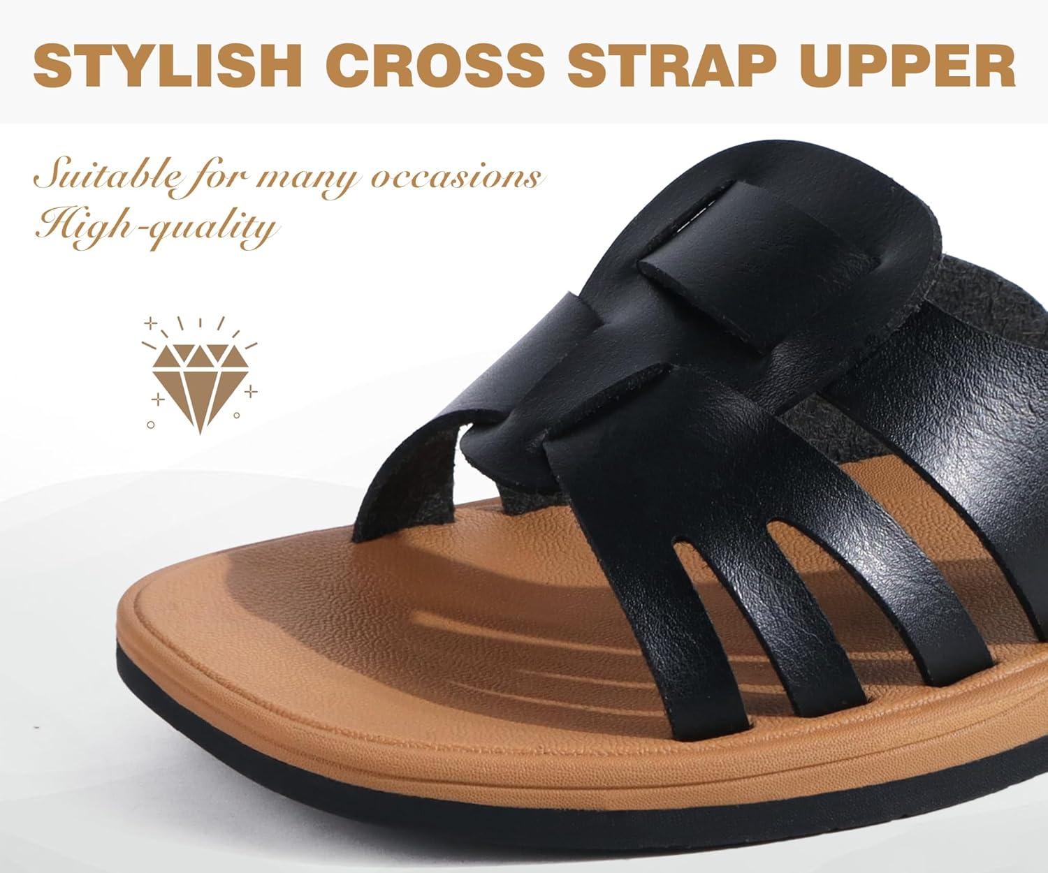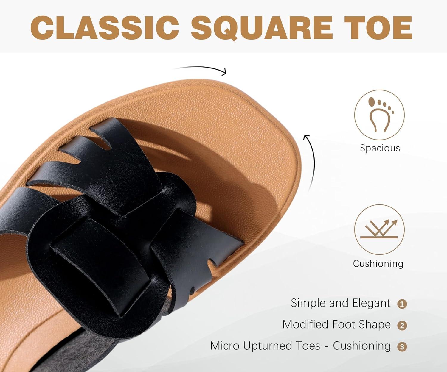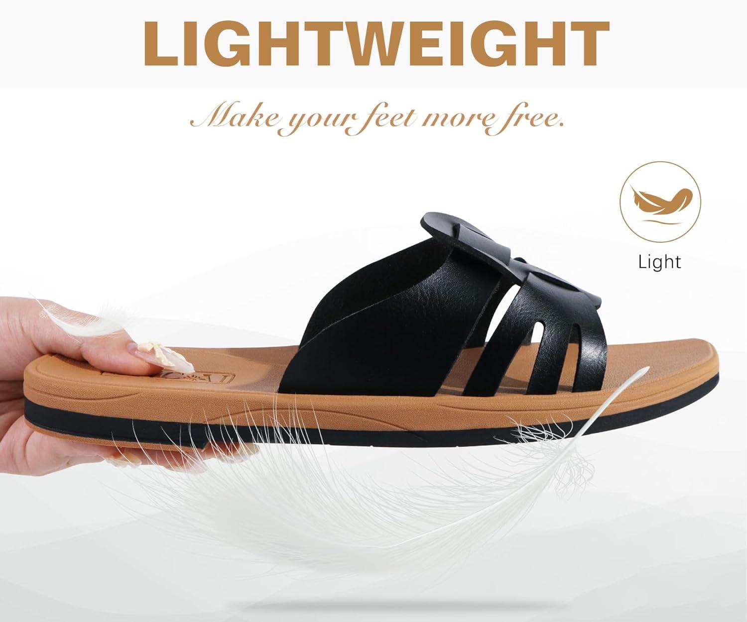 ONCAI Slides for Womens,Flat Dressy Square Toe Summer Beach Sandals for Woman with Comfortable Non-slip Rubber Soles Size 6-11(Black Khaki(runs Small Size Up))