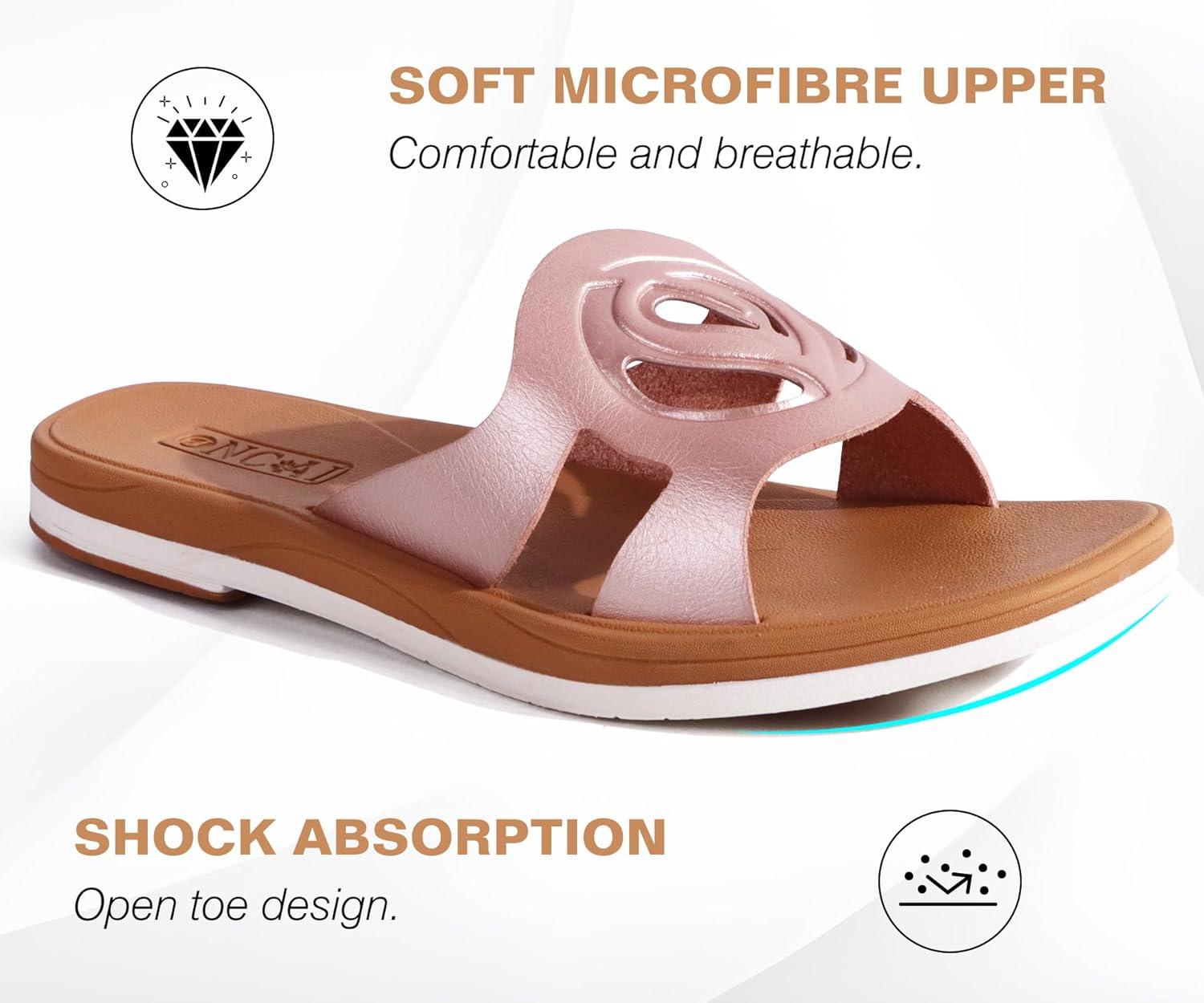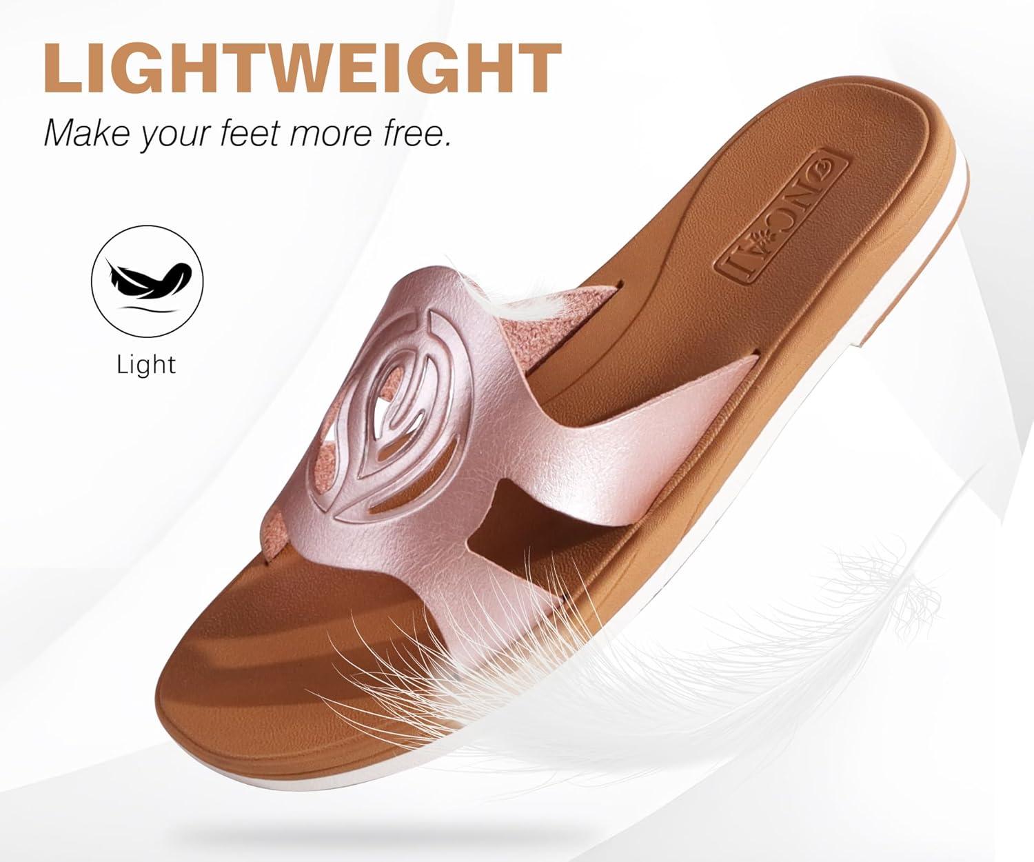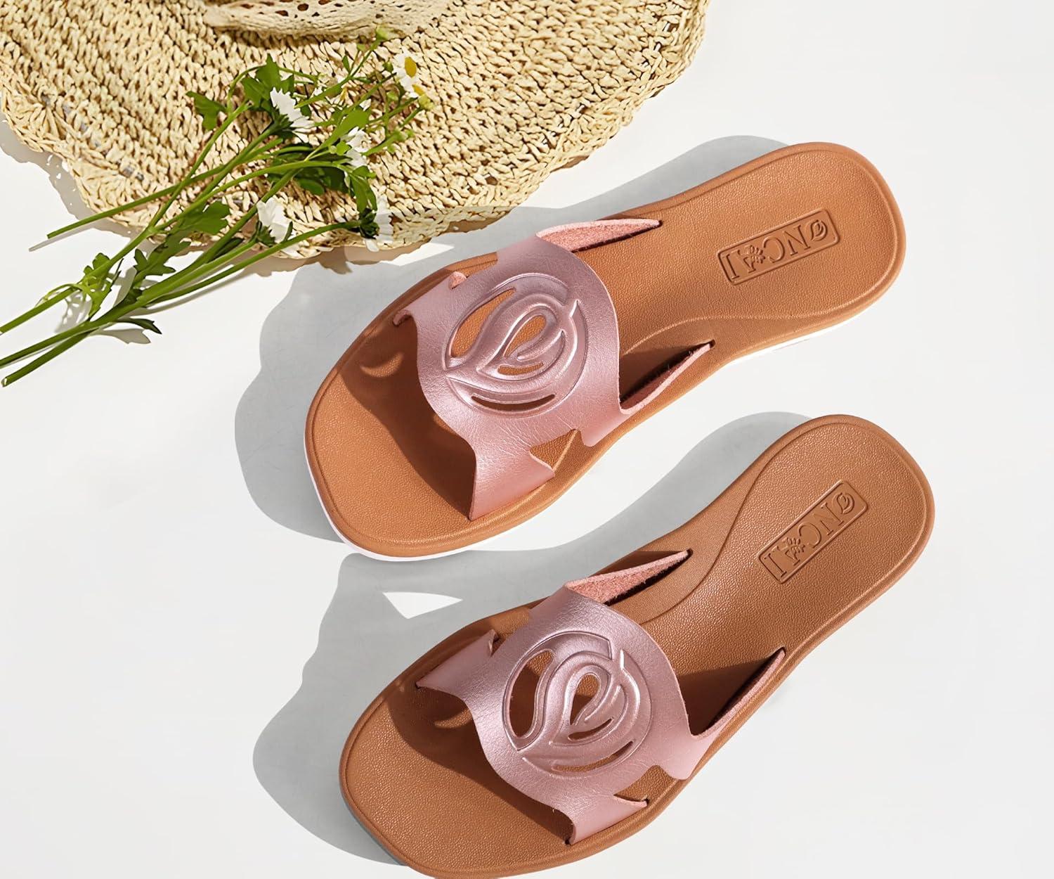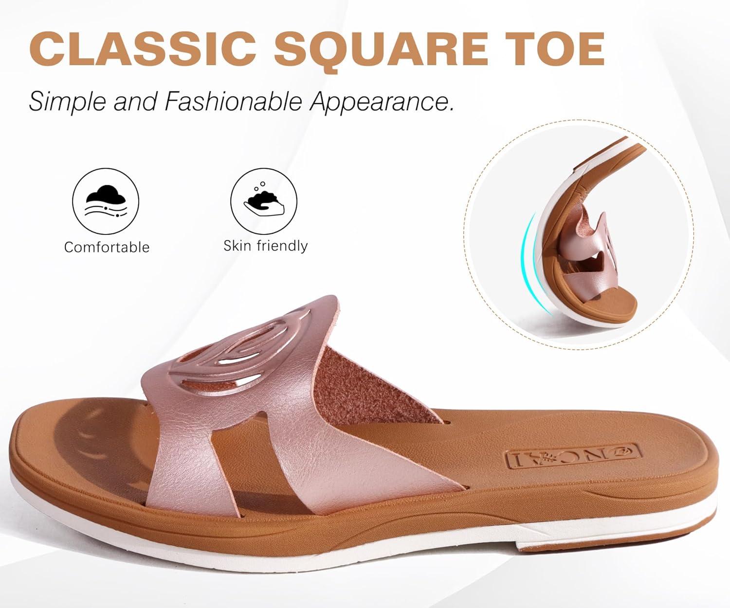 ONCAI Slides for Womens,Flat Dressy Square Toe Summer Beach Sandals for Woman with Comfortable Non-slip Rubber Soles Size 6-11(Fashion Rose Gold)