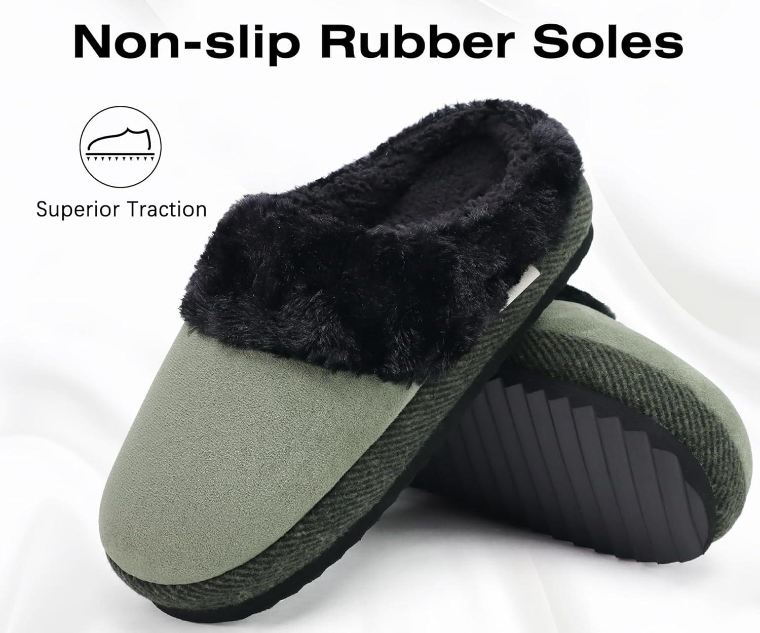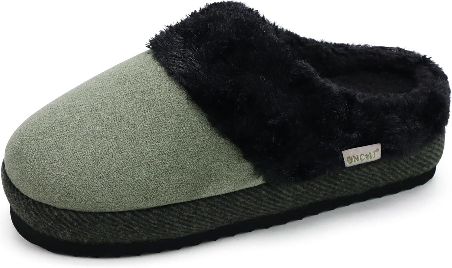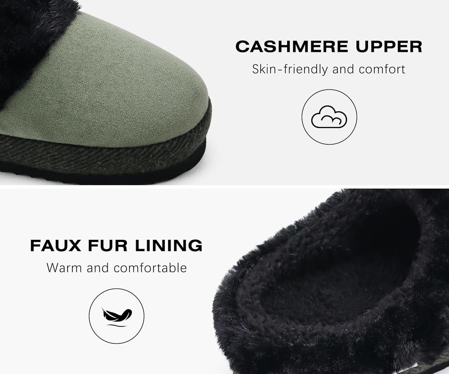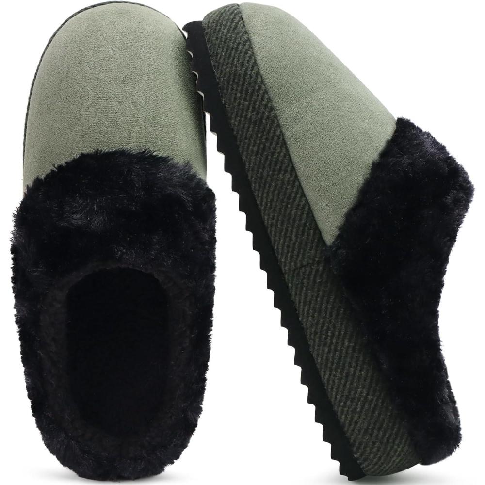 ONCAI Womam Slippers with Cushion Yoga Mat Faux Fur Lining Fuzzy Suede Warm Winter House Slippers Shoes Ladies Indoor and Outdoor Cozy Rubber Sole US Size 5-11(Green/Black)