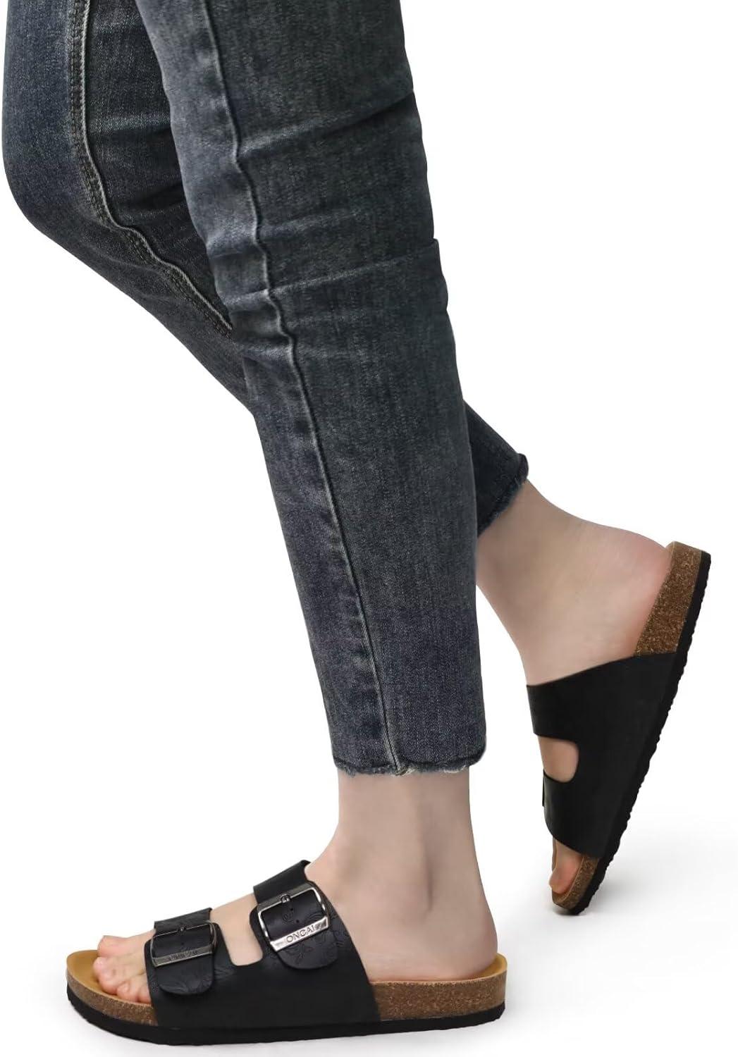 ONCAI Womens Flat Slide Sandals with Arch Support 2 Strap Adjustable Buckle Slip on Slides Shoes Non Slip Rubber Sole(Black Floral)