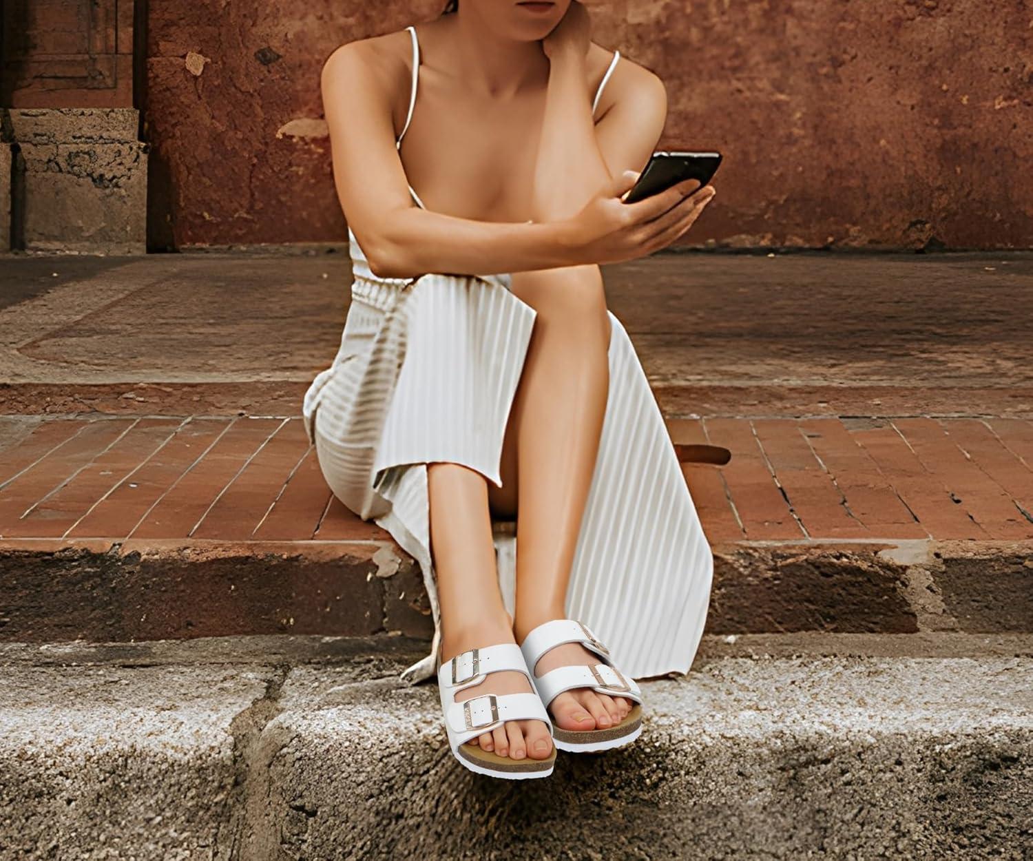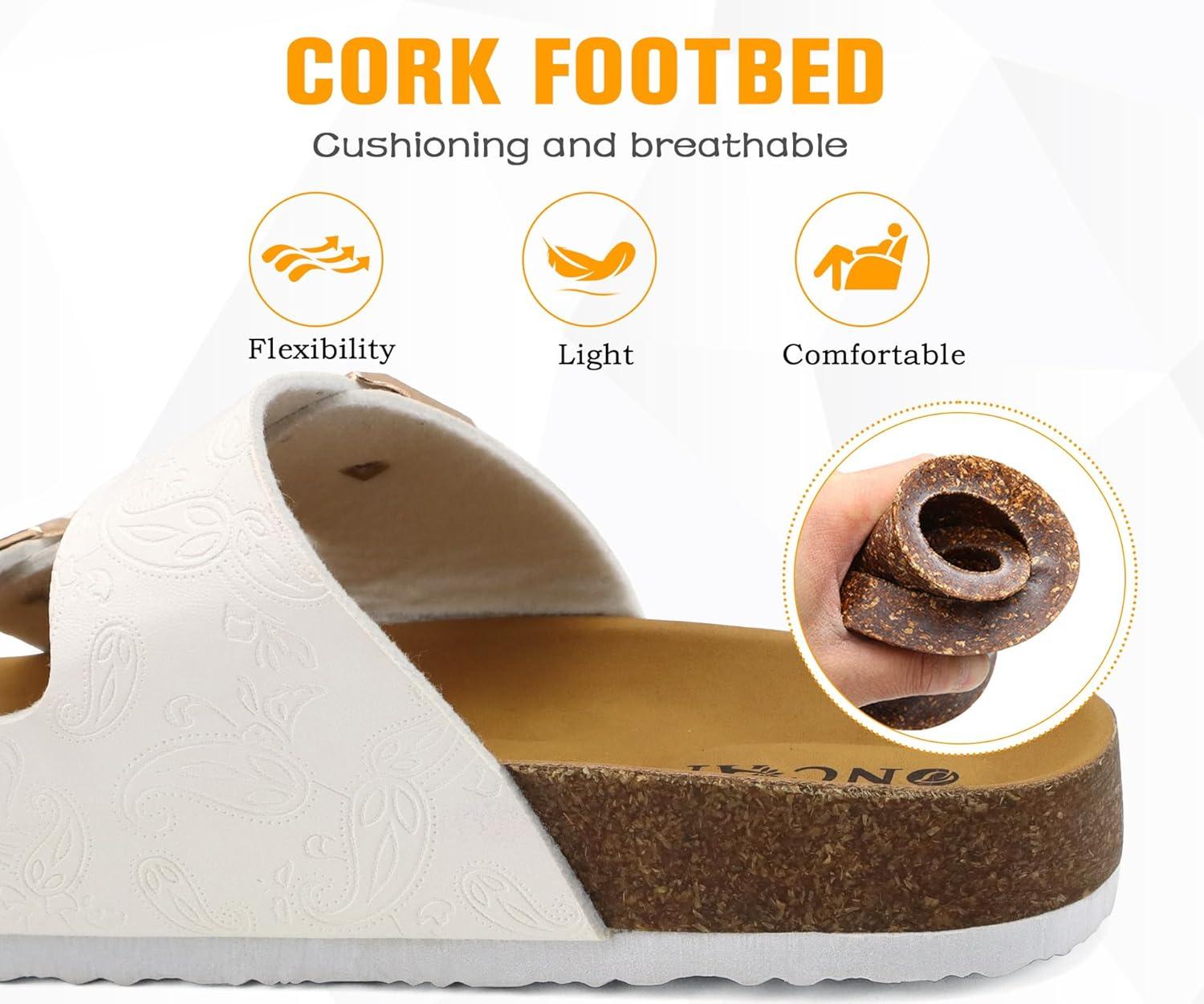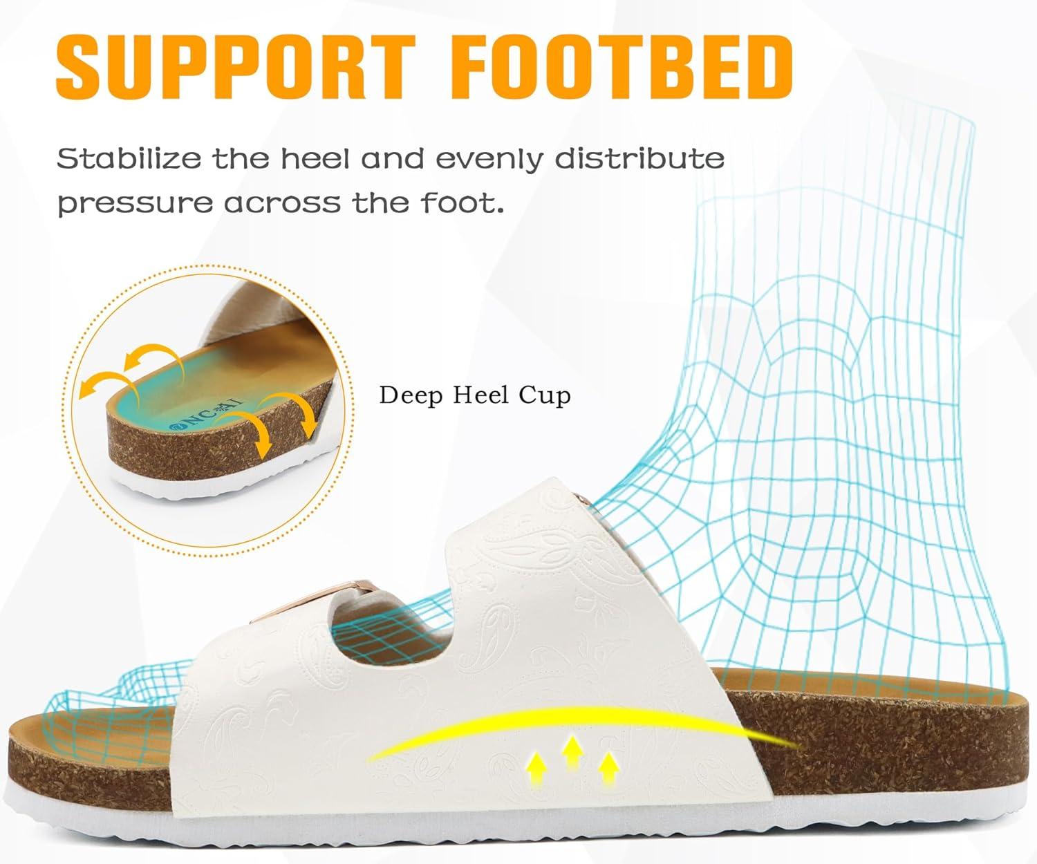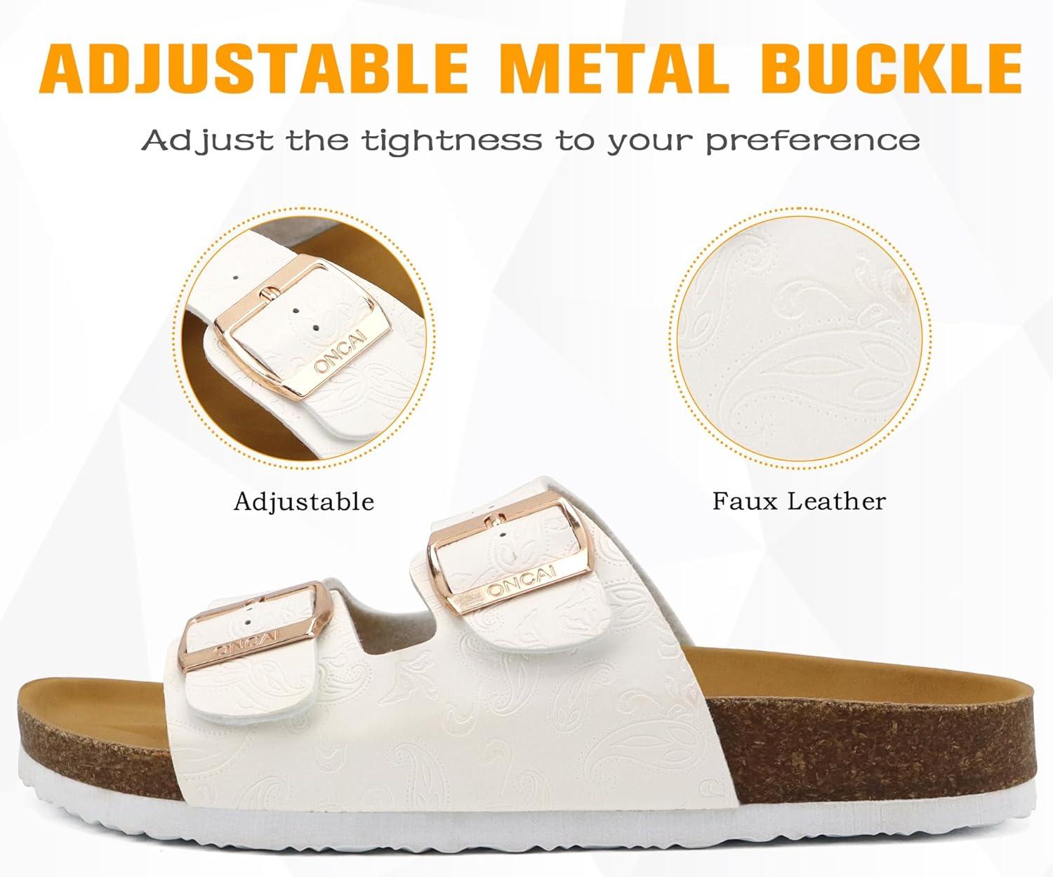 ONCAI Womens Flat Slide Sandals with Arch Support 2 Strap Adjustable Buckle Slip on Slides Shoes Non Slip Rubber Sole(White Floral)