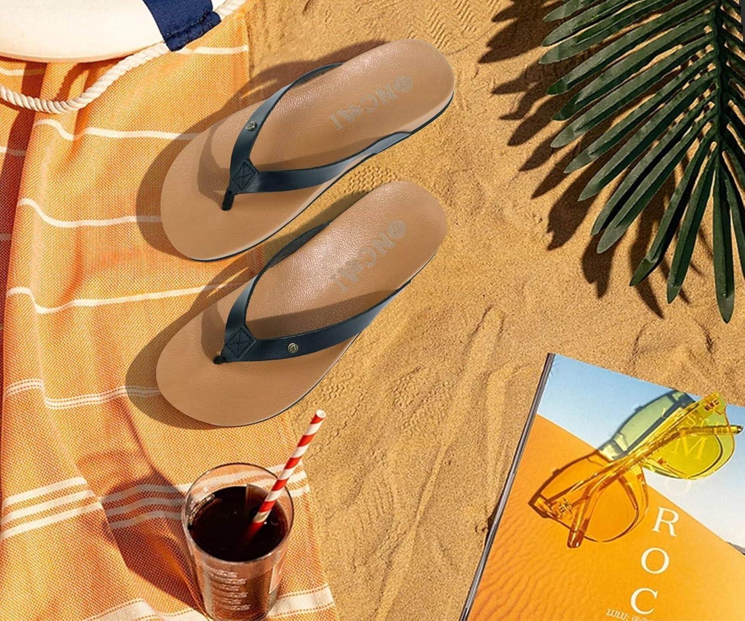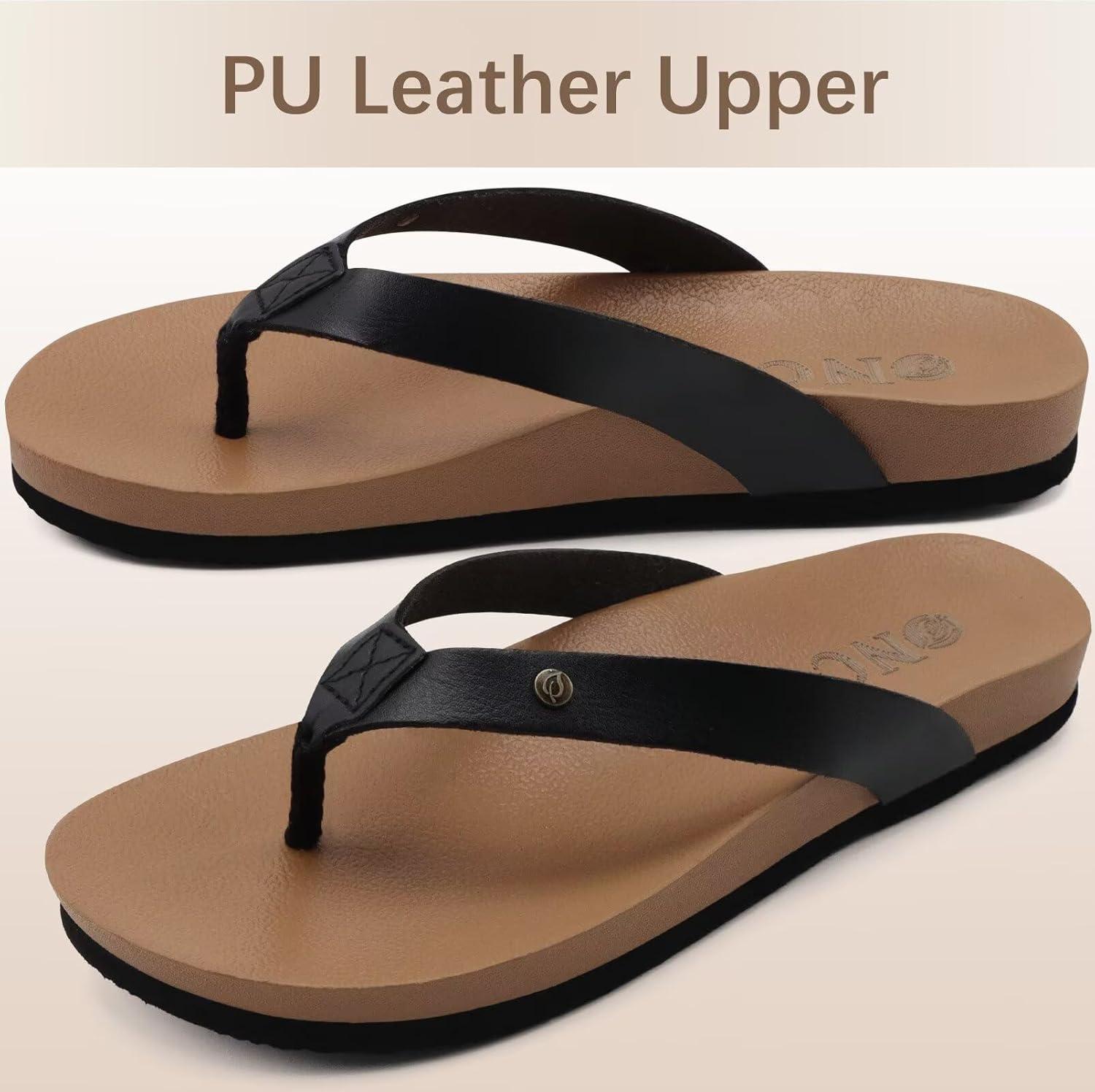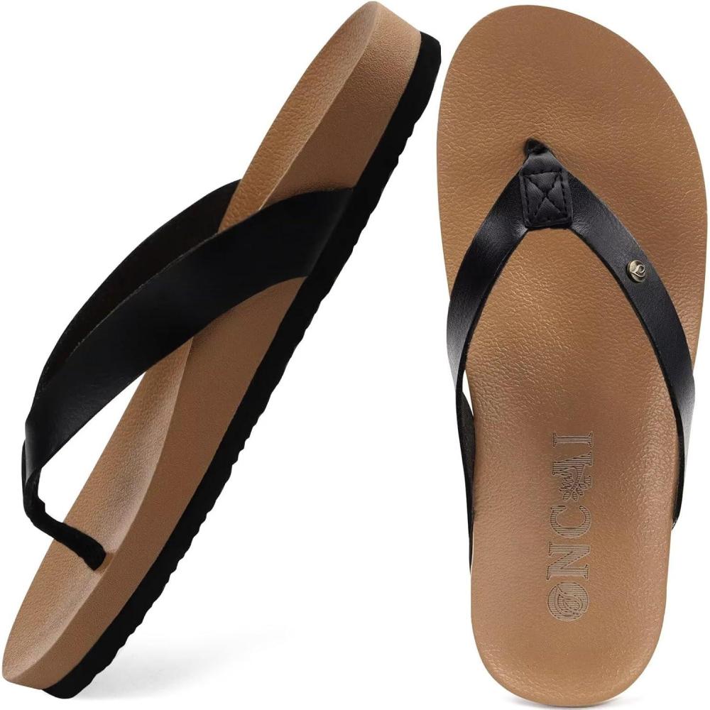 ONCAI Womens Flip Flops For Women Comfortable Strap Yoga Mat Non-Slip Women’s Thong Sandal Casual Summer Beach Slippers With Arch Support(Khaki/Black)