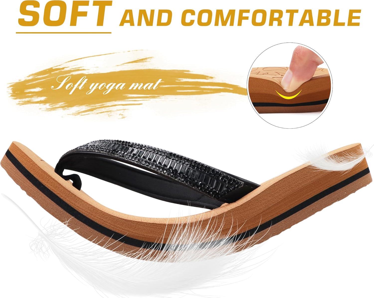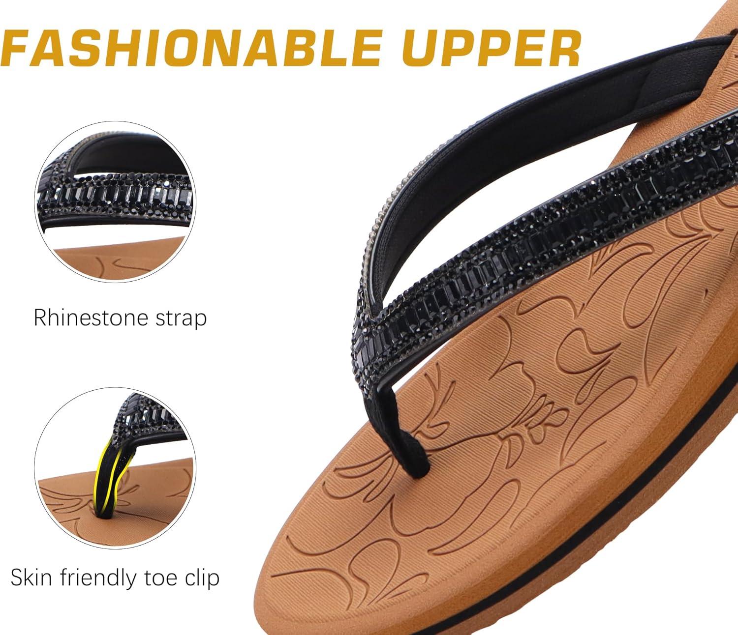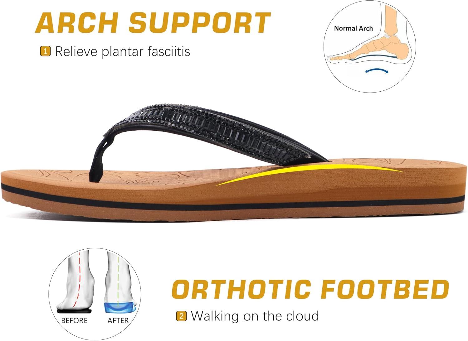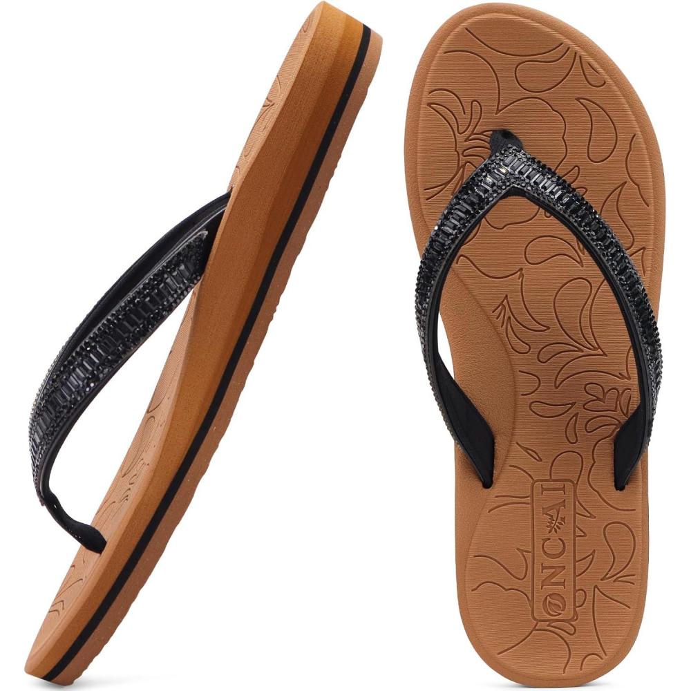 ONCAI Women’s Flip Flops with Rhinestone, Arch Support Yoga Mat Comfort Walking Summer Beach Thong Sandals with Plantar Fasciitis Rubber Soles US Size 5-11(Black/Khaki)