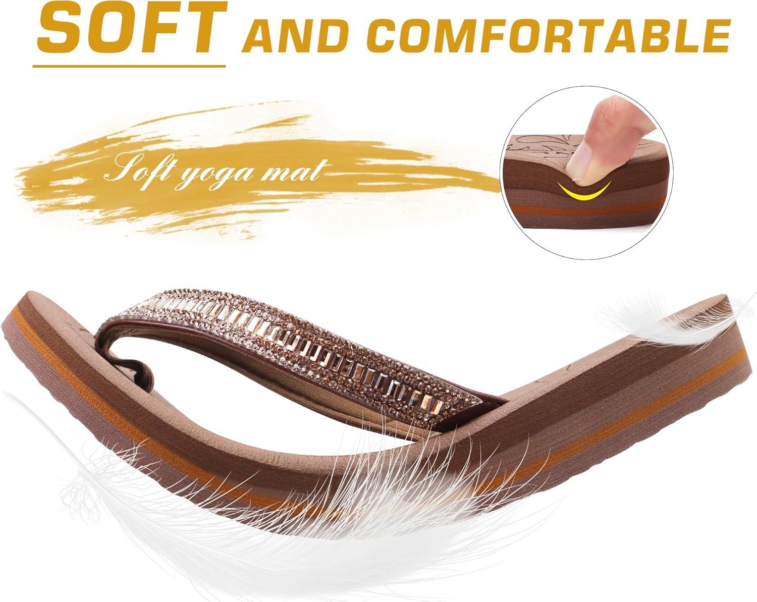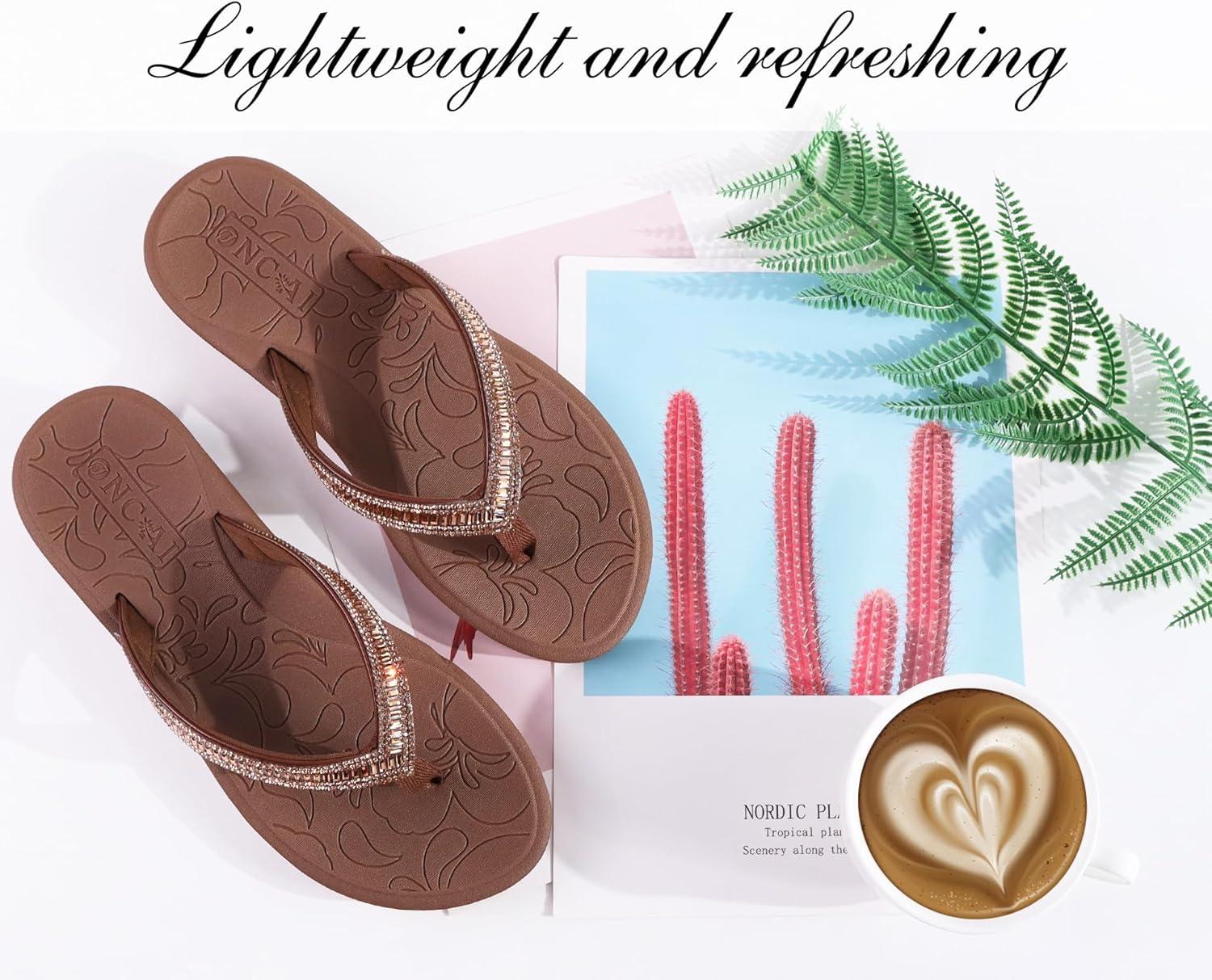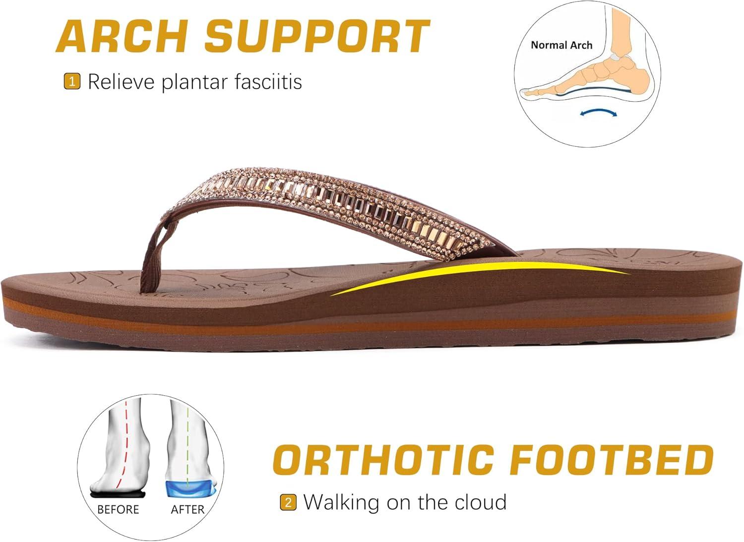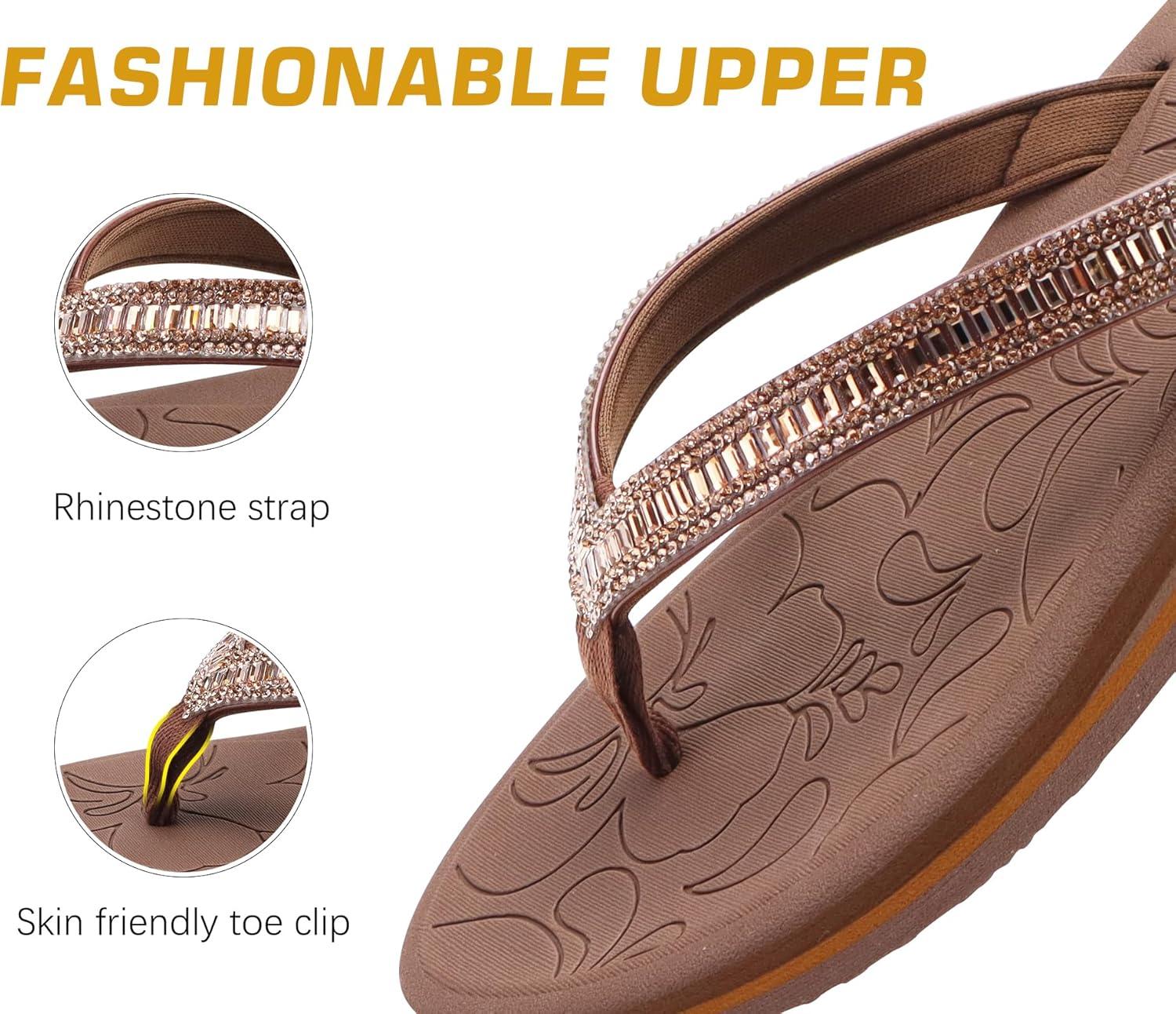 ONCAI Women’s Flip Flops with Rhinestone, Arch Support Yoga Mat Comfort Walking Summer Beach Thong Sandals with Plantar Fasciitis Rubber Soles US Size 5-11(Brown)