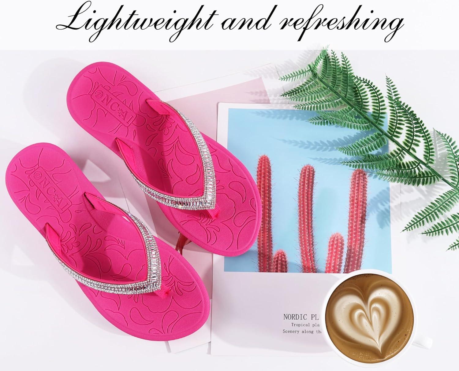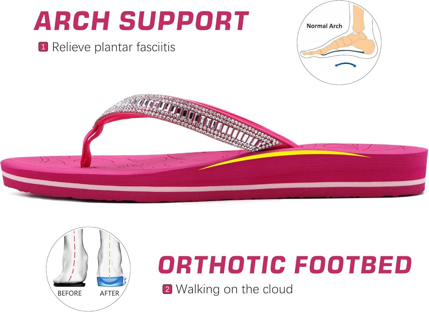 ONCAI Women’s Flip Flops with Rhinestone, Arch Support Yoga Mat Comfort Walking Summer Beach Thong Sandals with Plantar Fasciitis Rubber Soles US Size 5-11(Hot Pink)