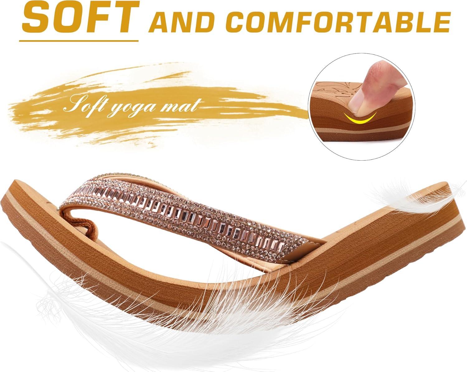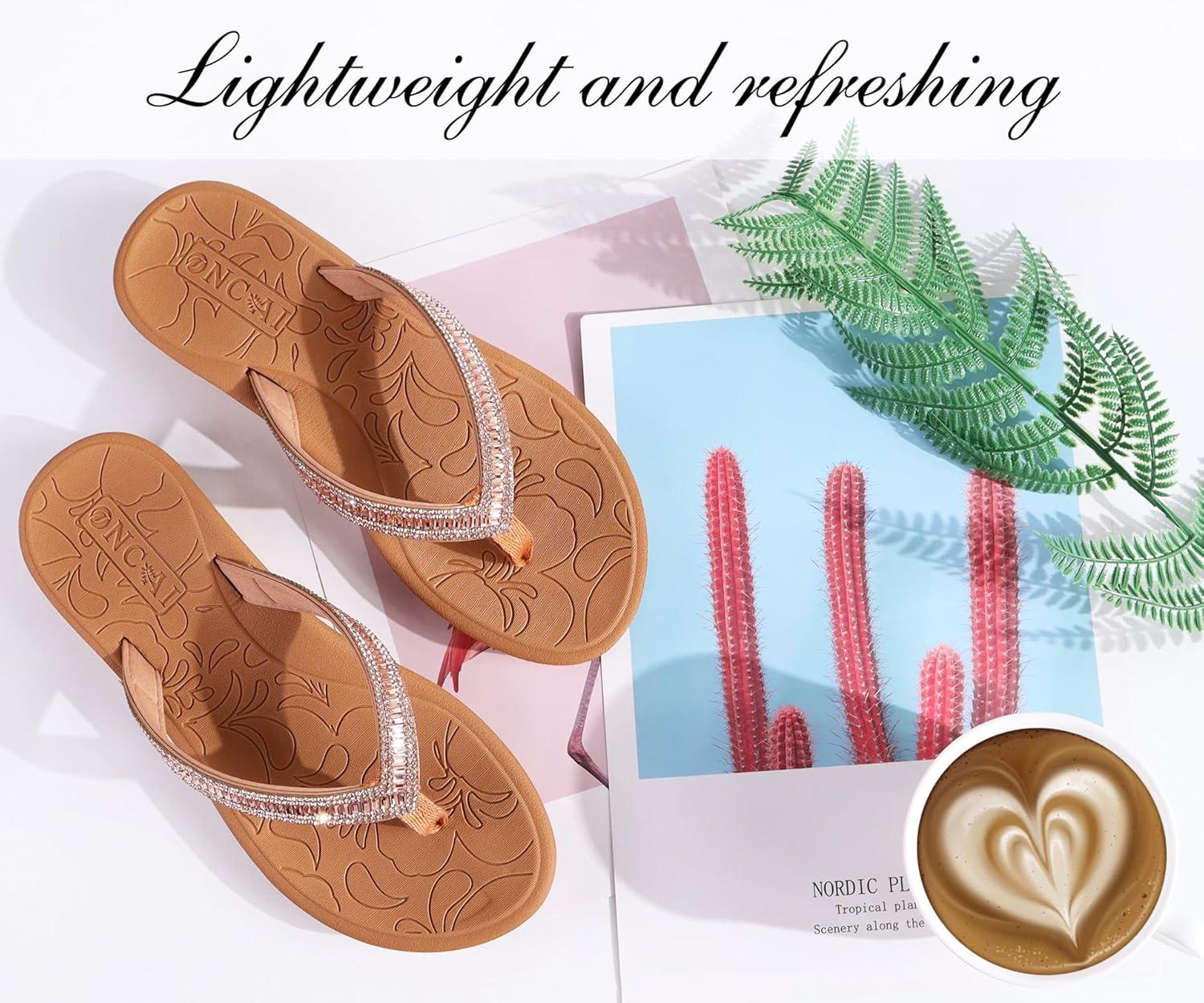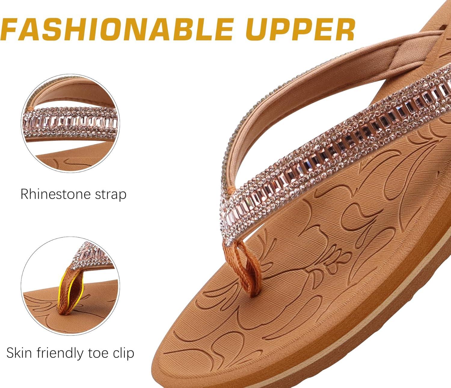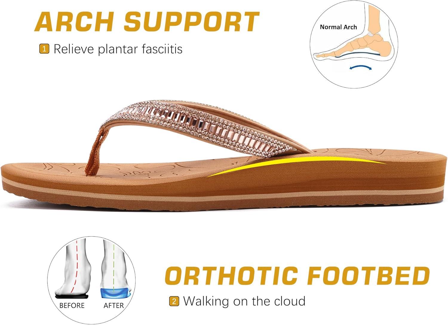 ONCAI Women’s Flip Flops with Rhinestone, Arch Support Yoga Mat Comfort Walking Summer Beach Thong Sandals with Plantar Fasciitis Rubber Soles US Size 5-11(Khaki)