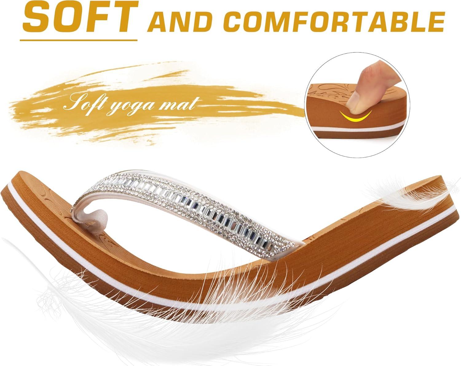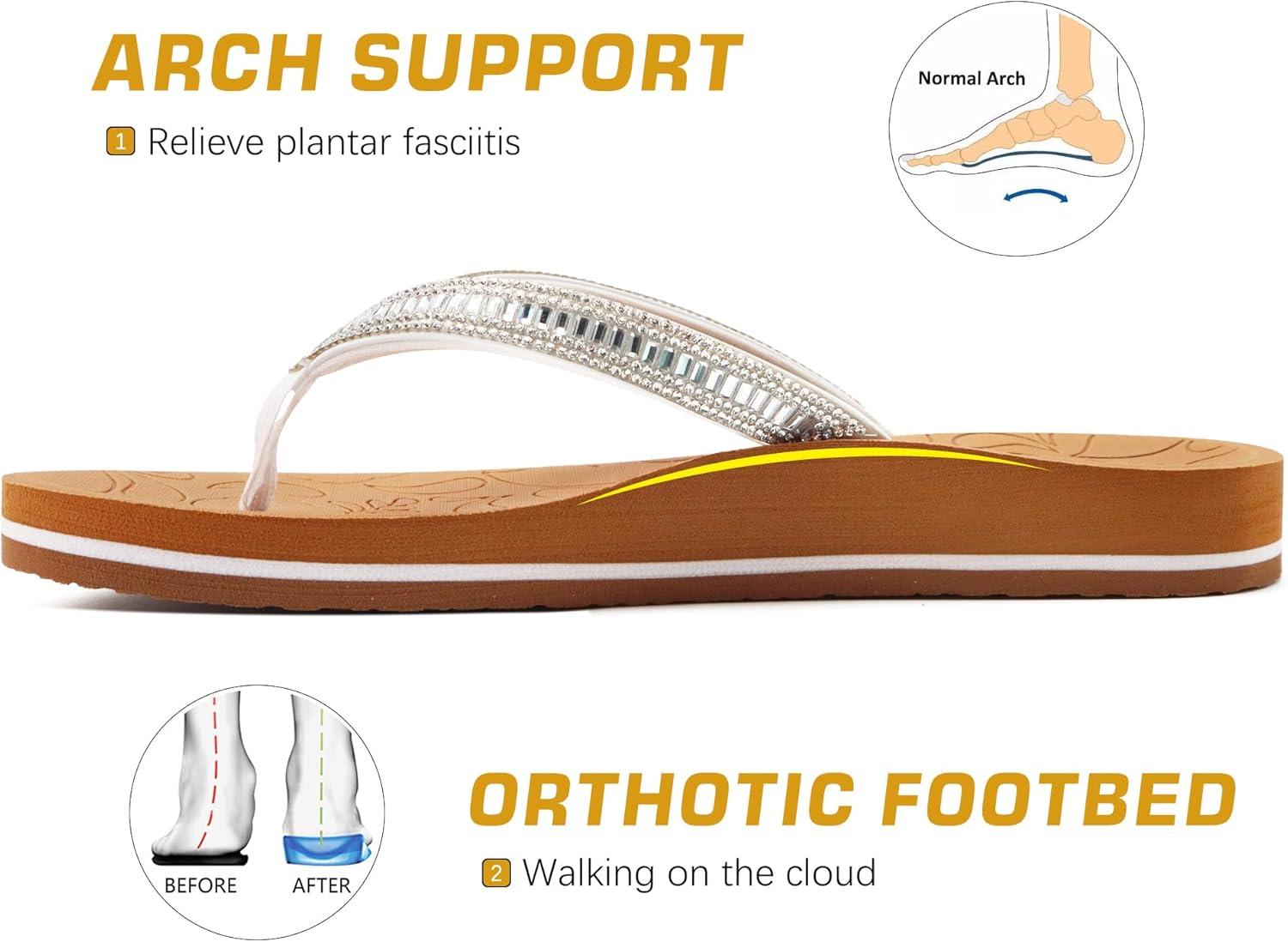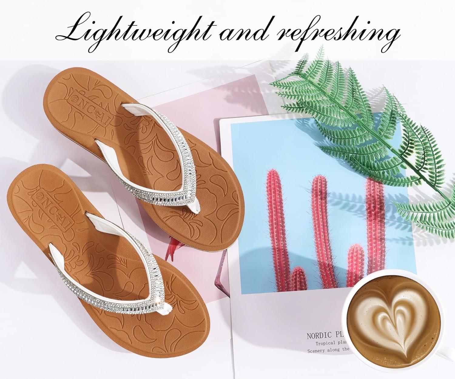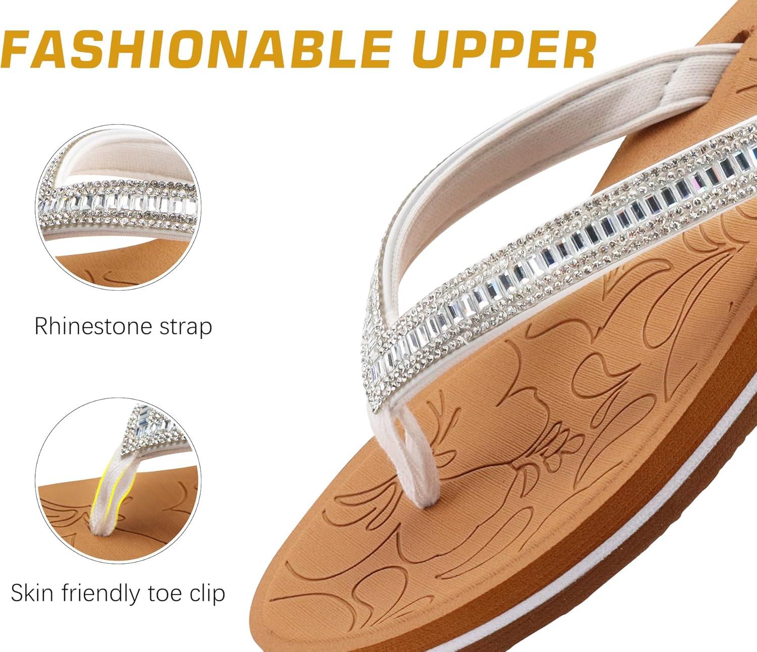 ONCAI Women’s Flip Flops with Rhinestone, Arch Support Yoga Mat Comfort Walking Summer Beach Thong Sandals with Plantar Fasciitis Rubber Soles US Size 5-11(White/Khaki)