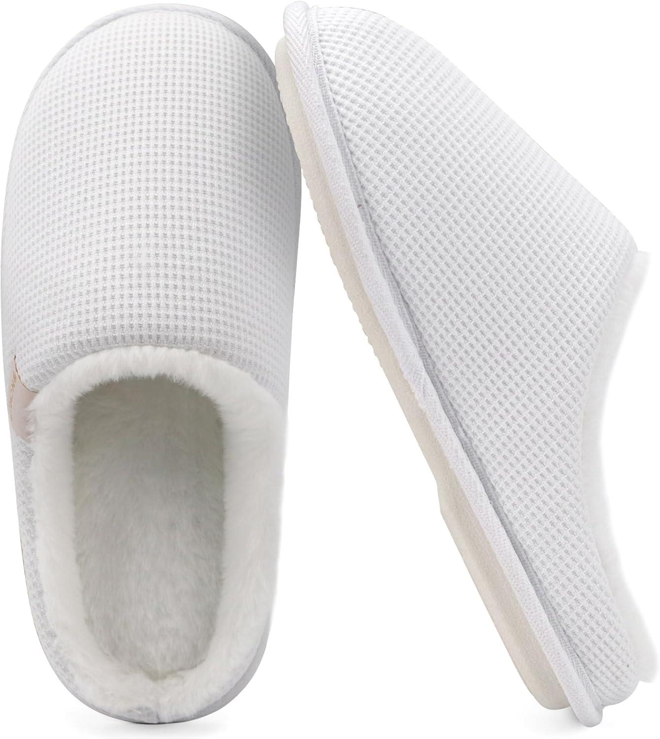 ONCAI Women’s House Slippers, Cushion Memory Foam Waffle Upper Home Comfortable Warm Winter Cozy Soft Lightweight Indoor Best House Shoes Non-slip Rubber Sole US Size 5-11(Plush White)