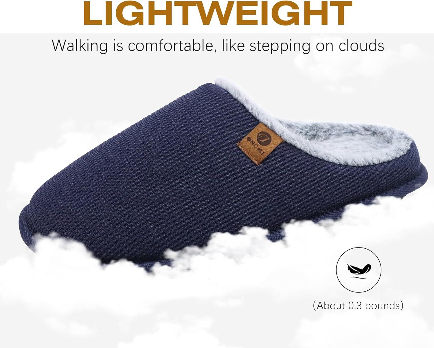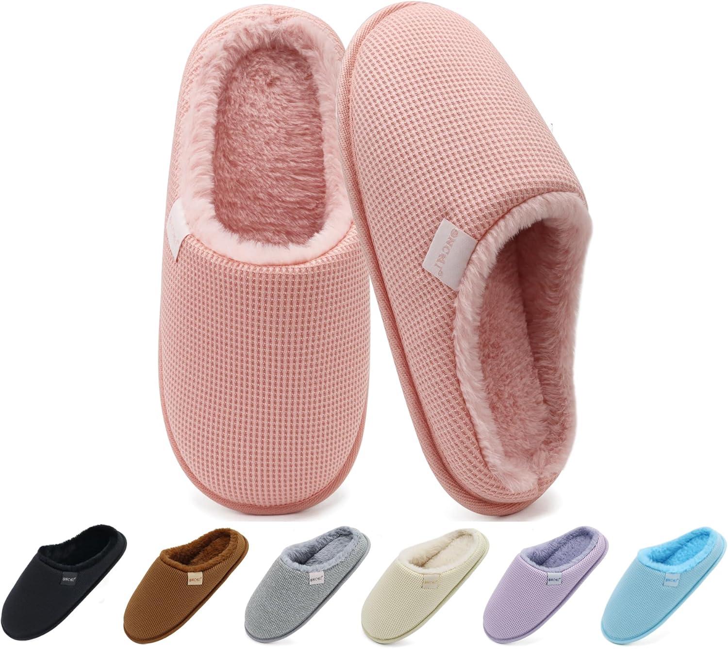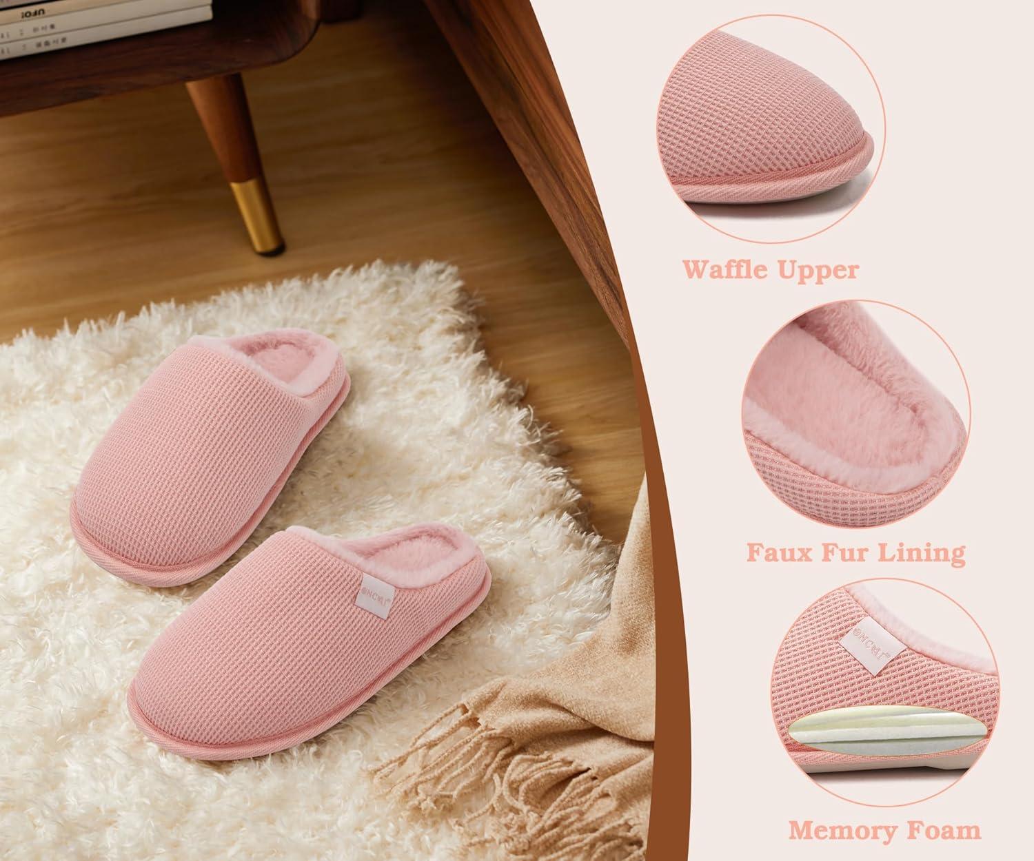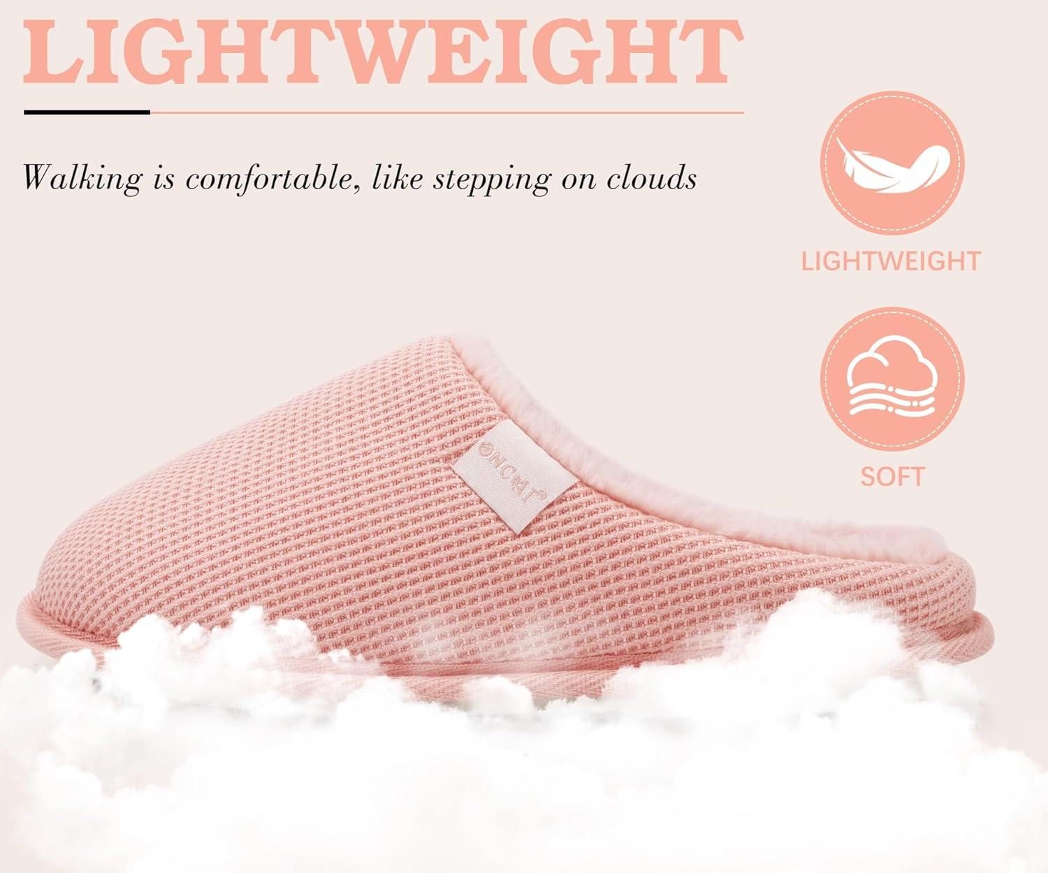 ONCAI Women’s House Slippers in Pink, US Size 9, and Men’s House Slippers in Blue, US Size 12.