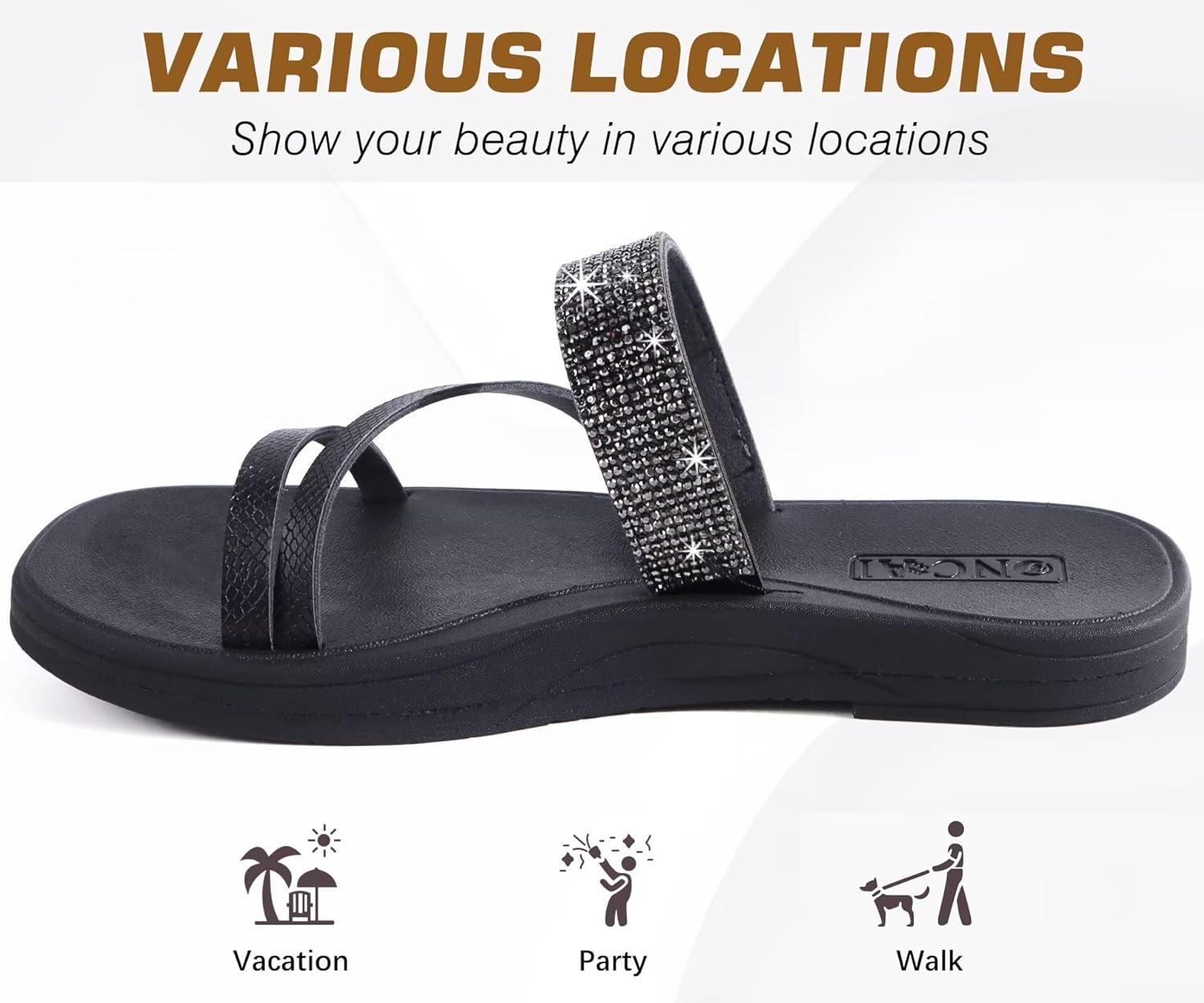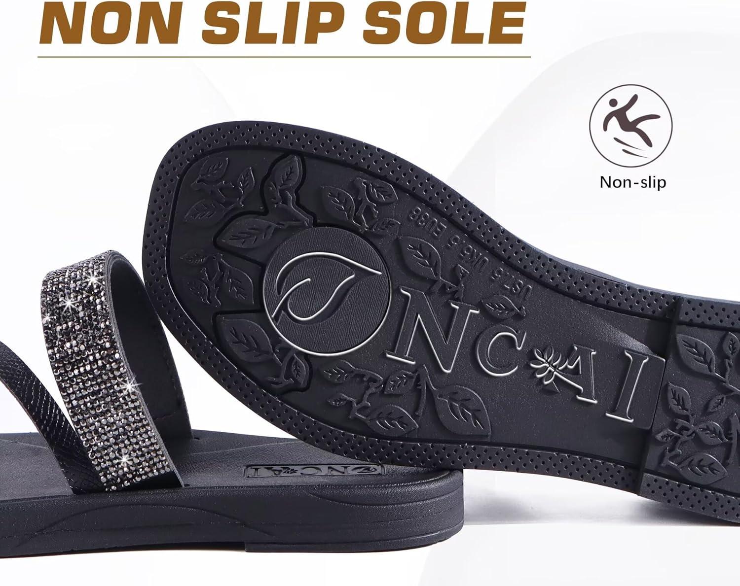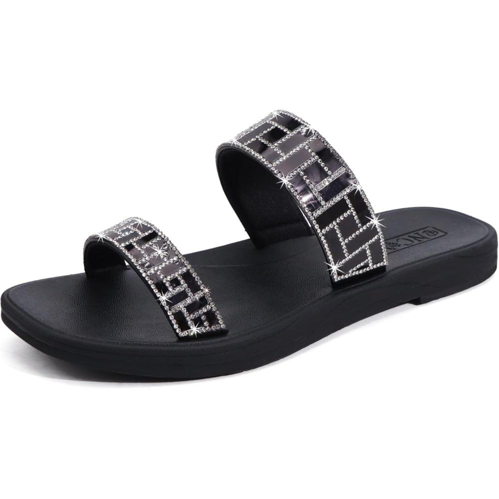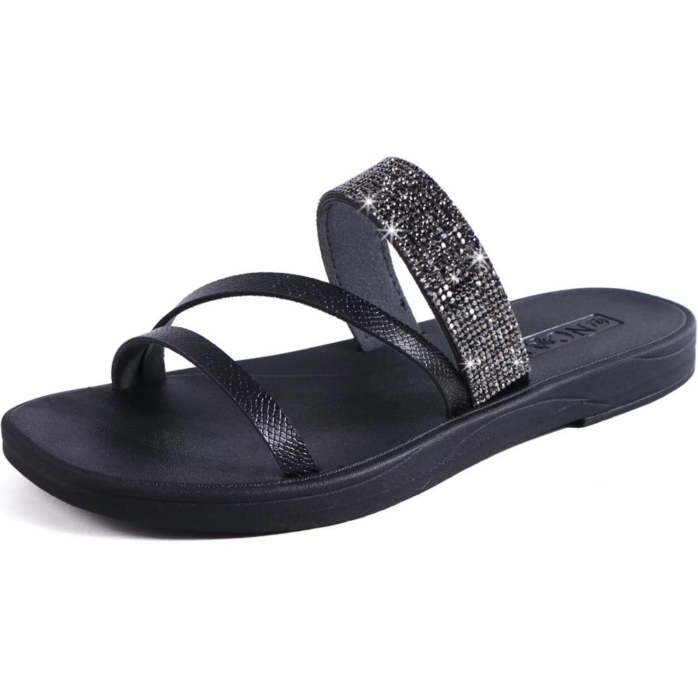 ONCAI Women’s Slide Sandals Trendy Square Summer Flat Dressy Sandals for Women 2025 Cross Strappy Open Split-Toe Ring with Slip-on Rubber Soles(All-black)