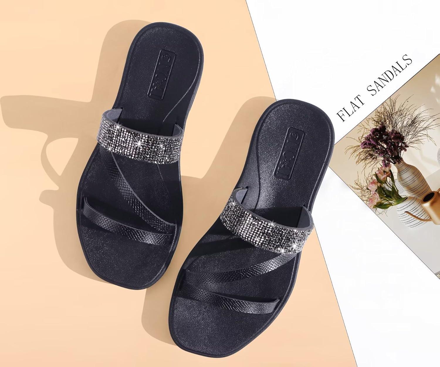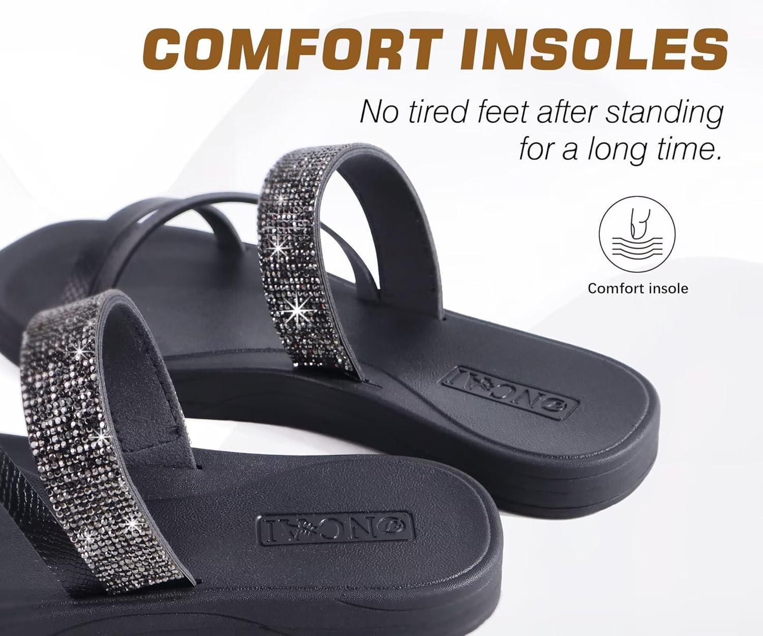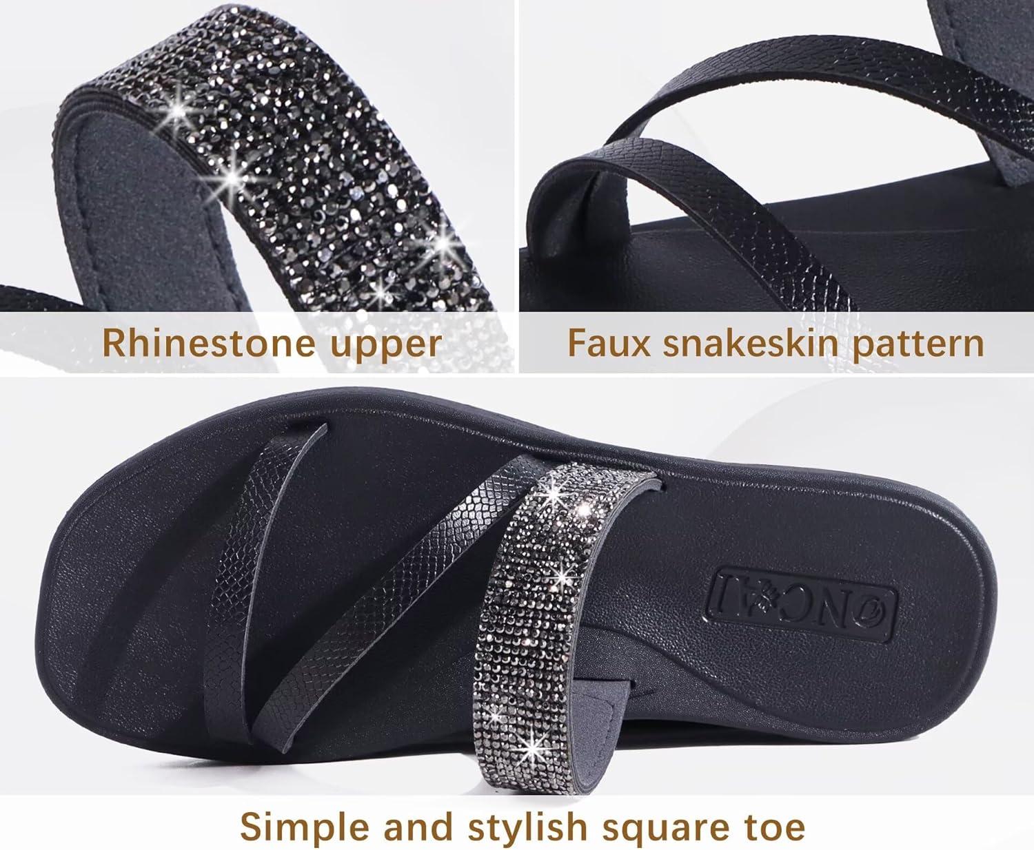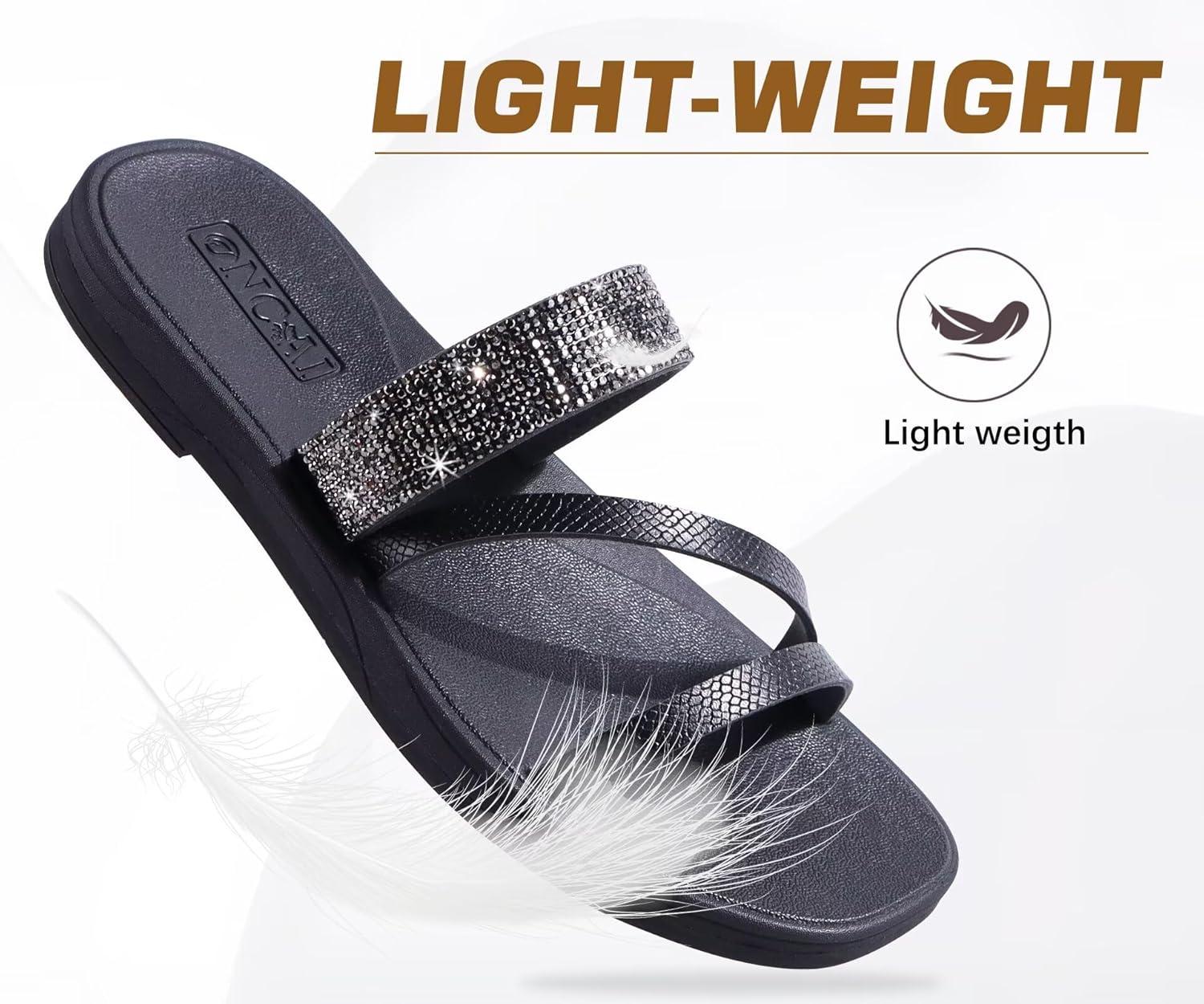 ONCAI Women’s Slide Sandals Trendy Square Summer Flat Dressy Sandals for Women 2025 Cross Strappy Open Split-Toe Ring with Slip-on Rubber Soles(All-black)