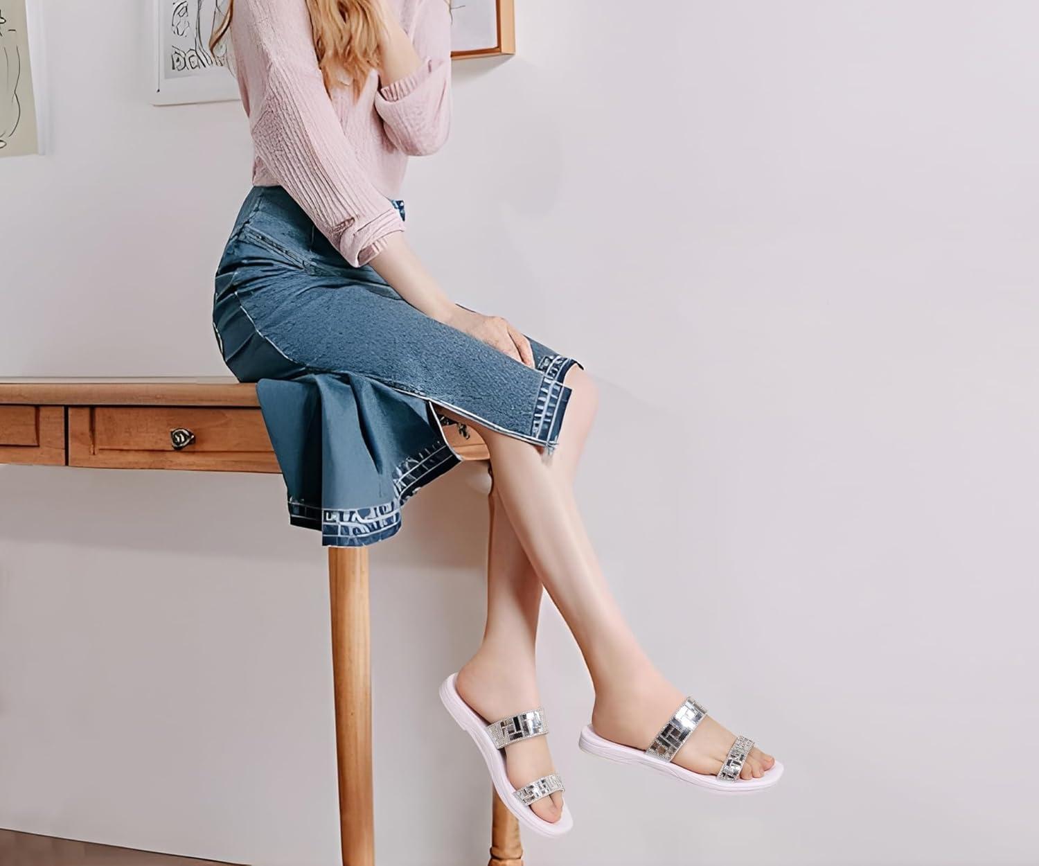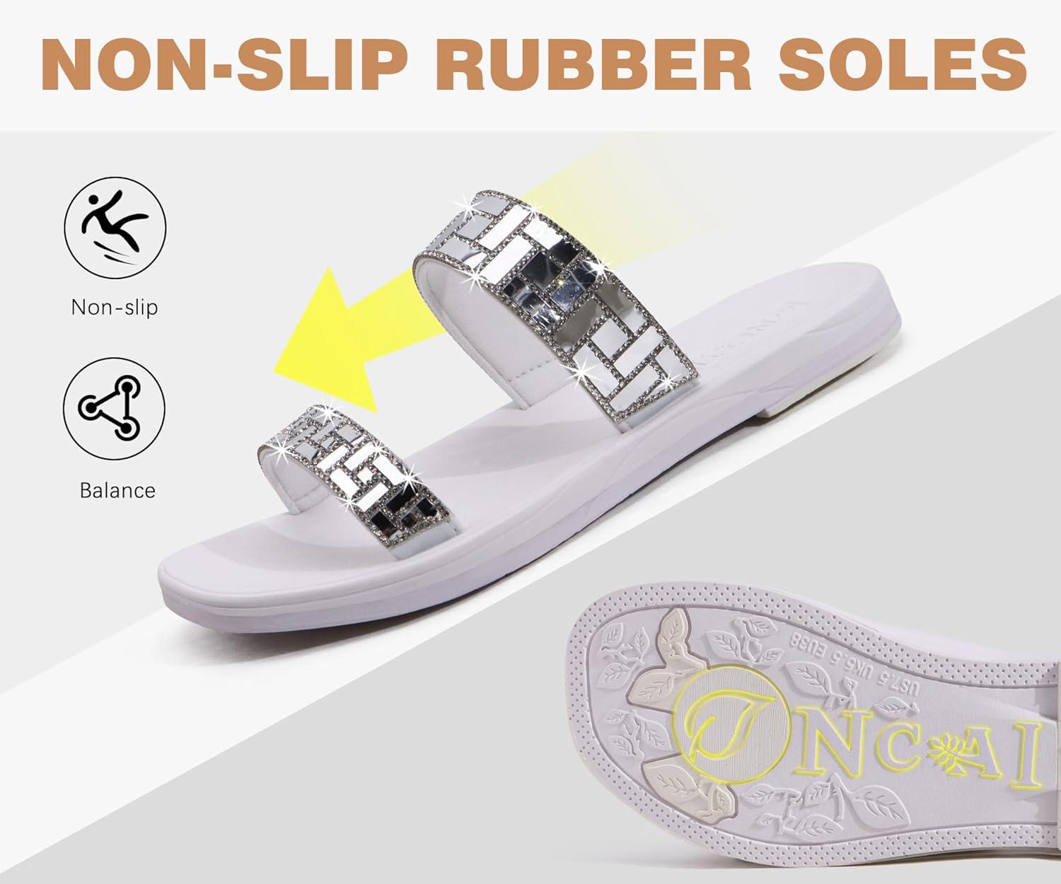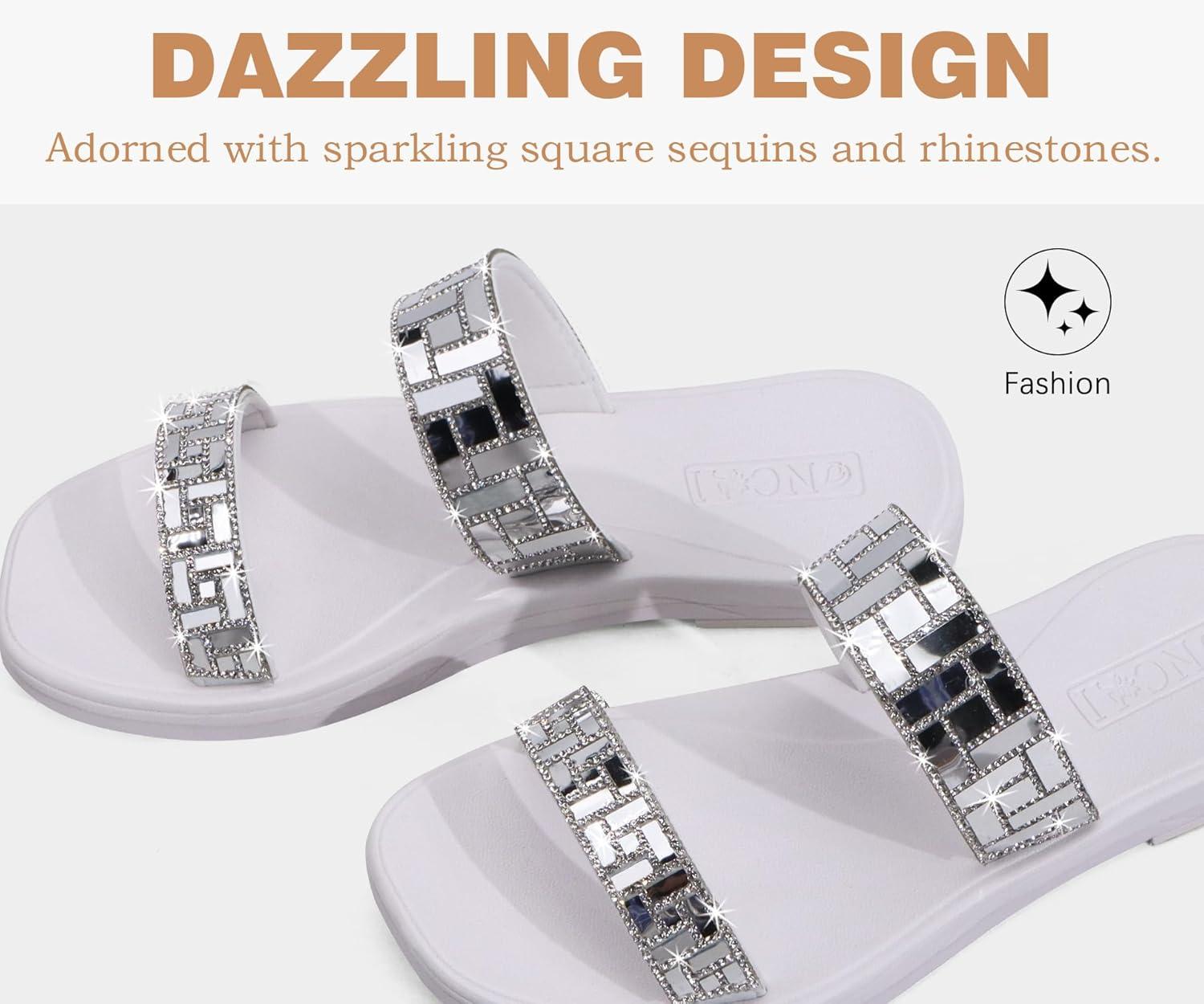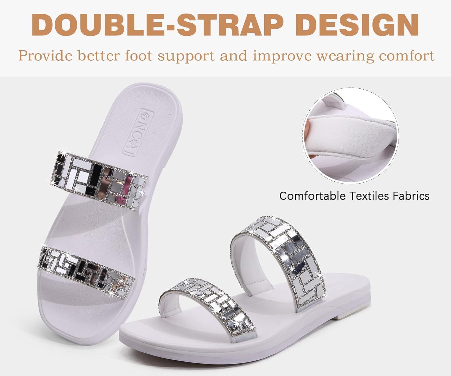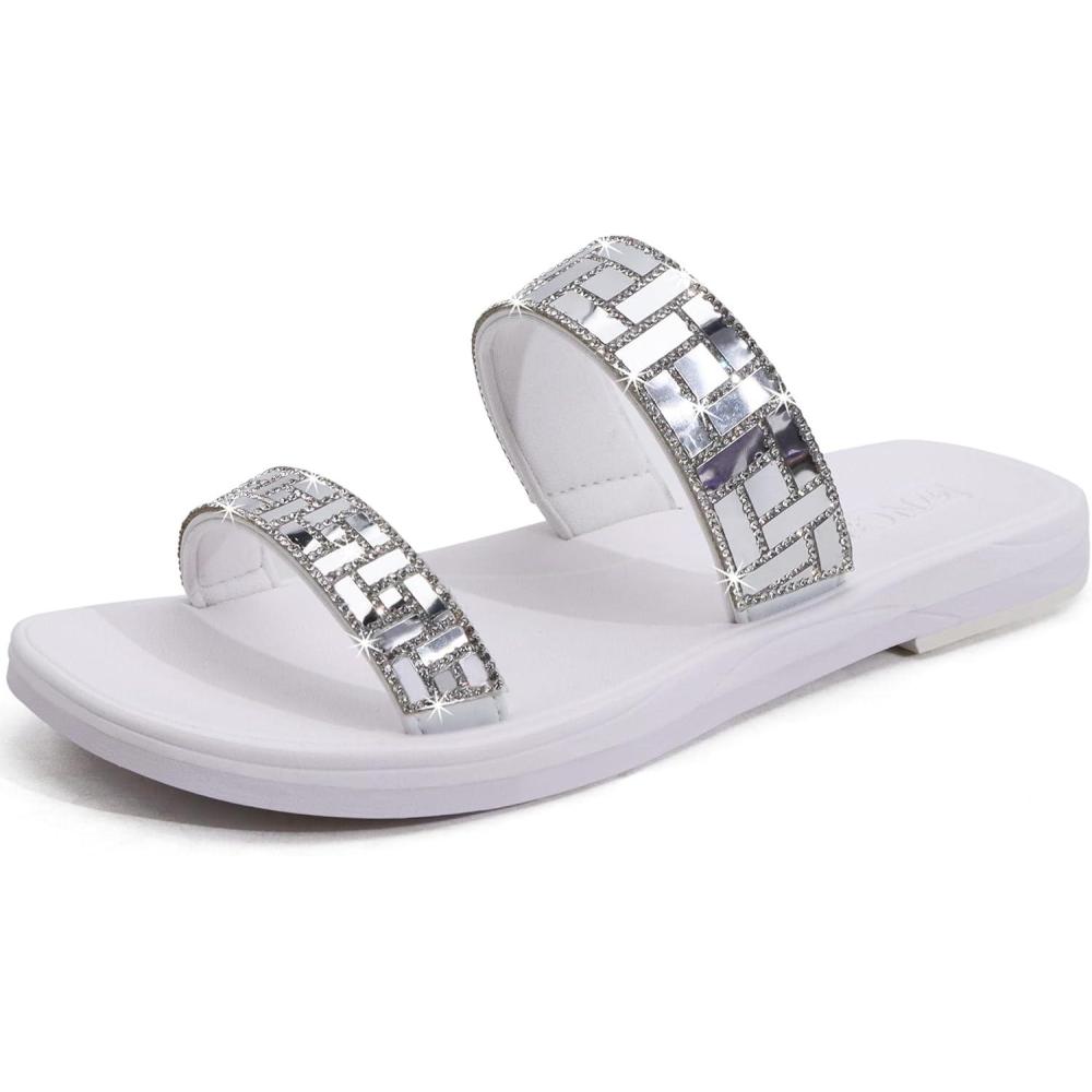 ONCAI Women’s Slide Sandals Trendy Square Summer Flat Dressy Sandals for Women 2025 Cross Strappy Open Split-Toe Ring with Slip-on Rubber Soles(Silver White(run Small size Up))