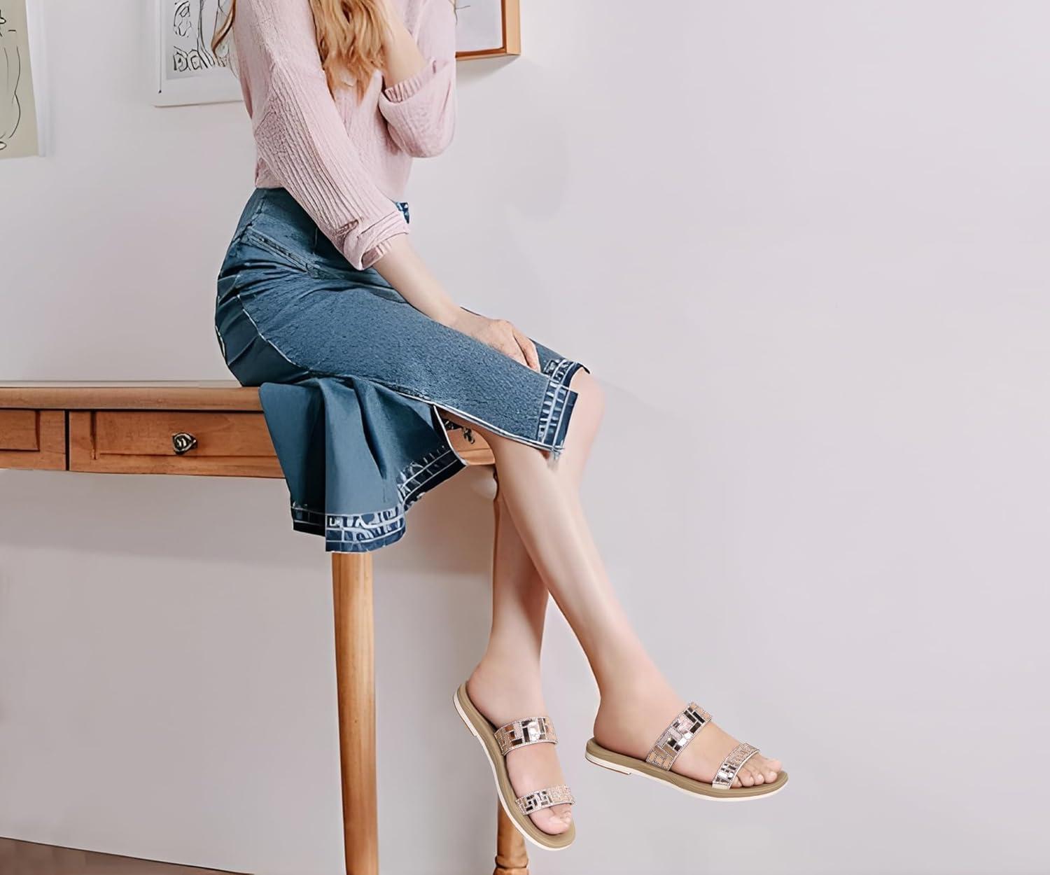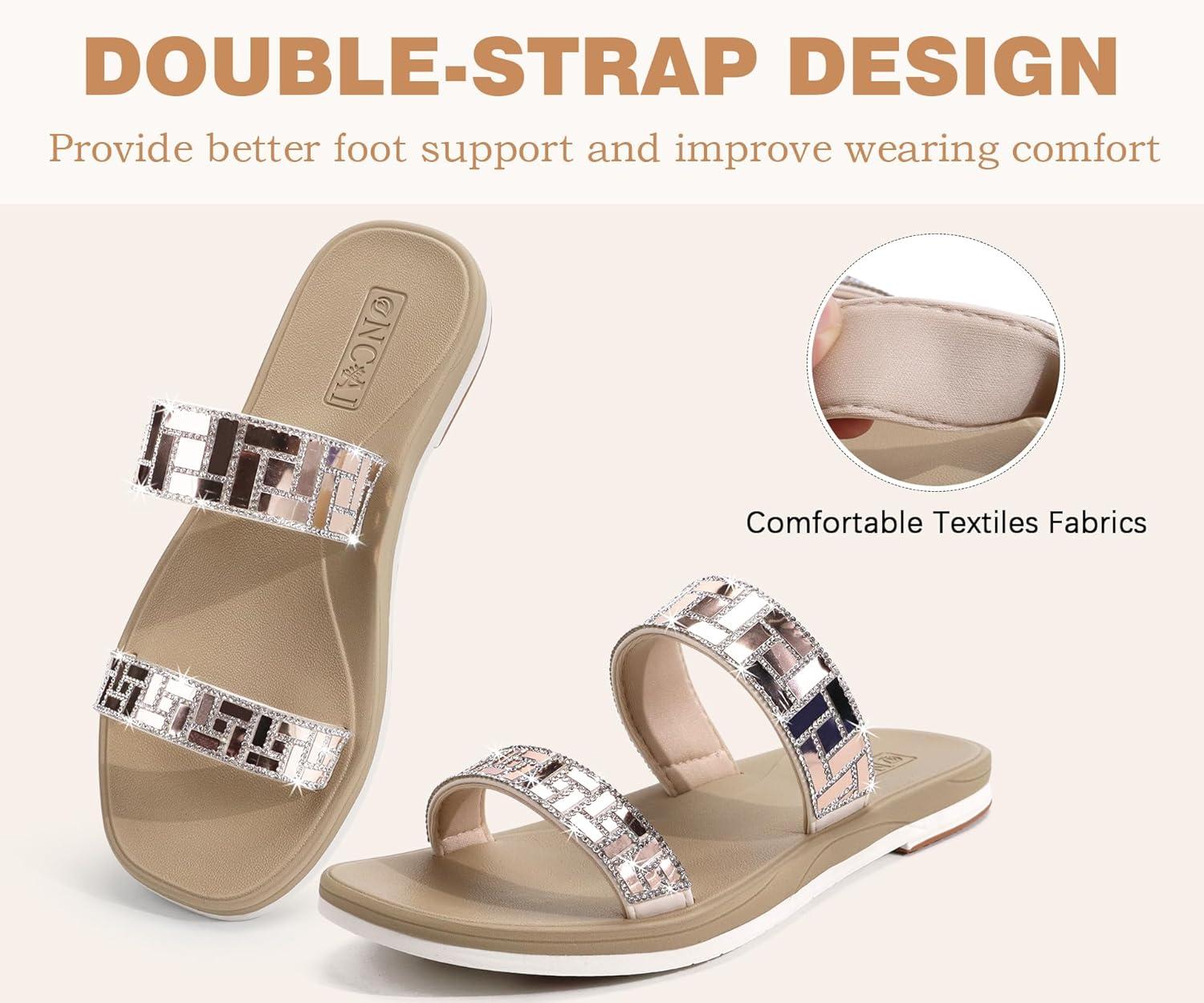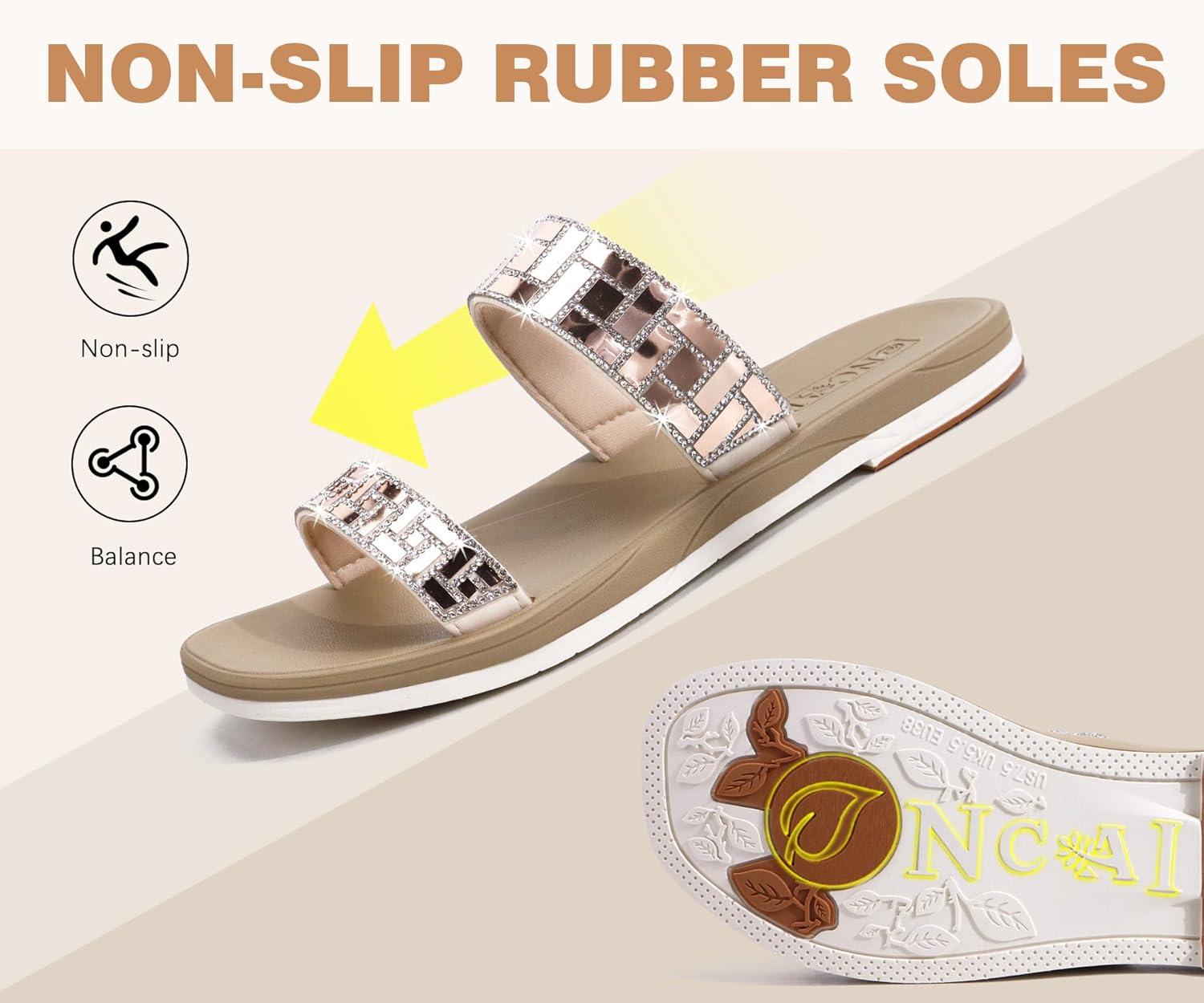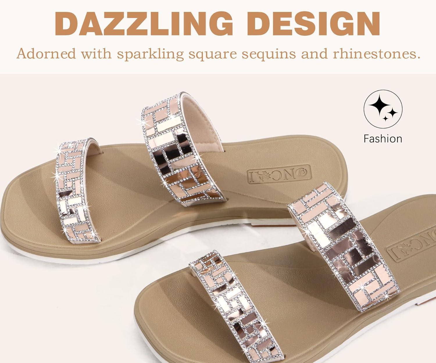 ONCAI Women’s Slide Sandals Trendy Square Summer Flat Dressy Sandals for Women 2025 Cross Strappy Open Split-Toe Ring with Slip-on Rubber Soles(Sparkling Beige(run Small size Up))