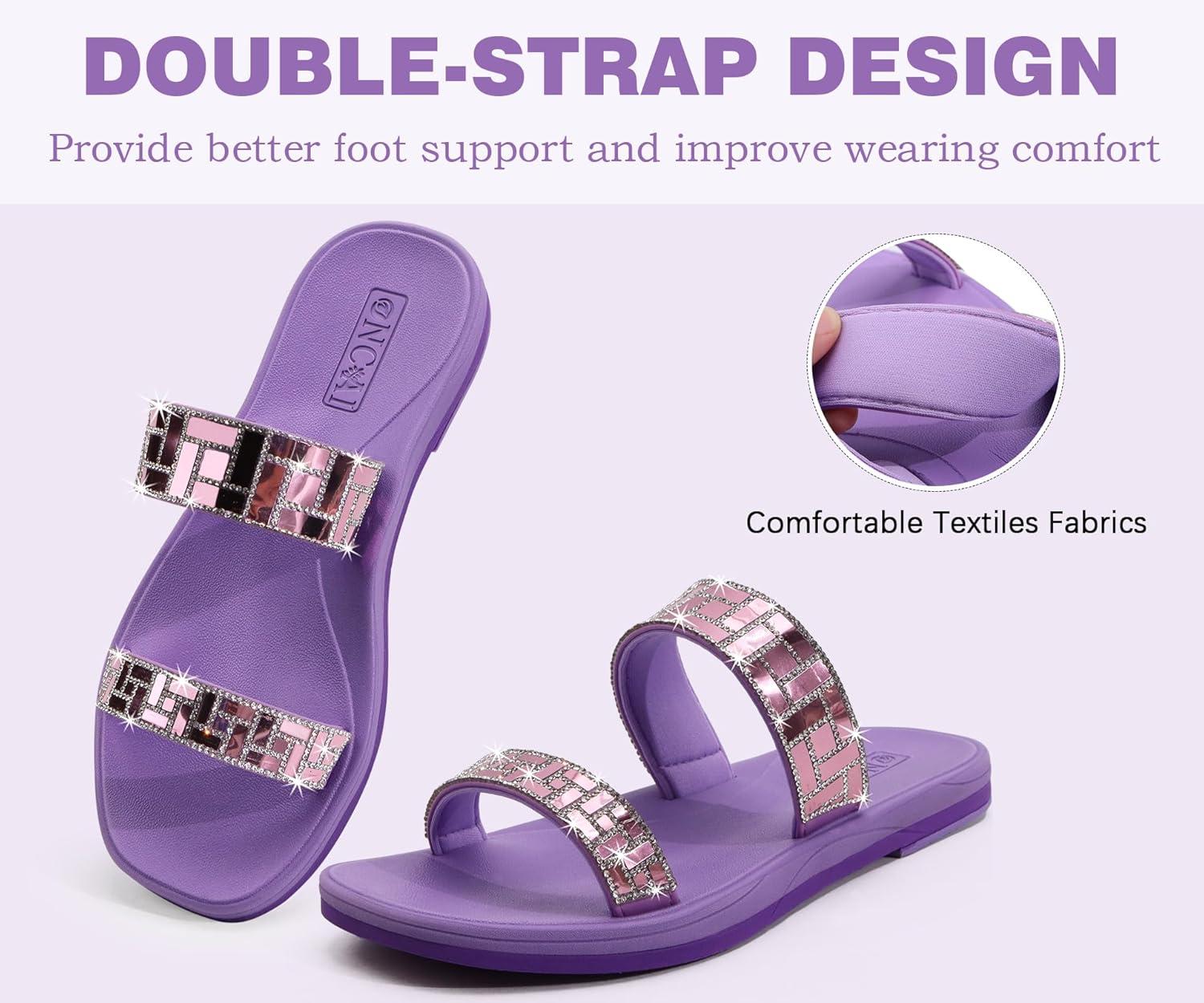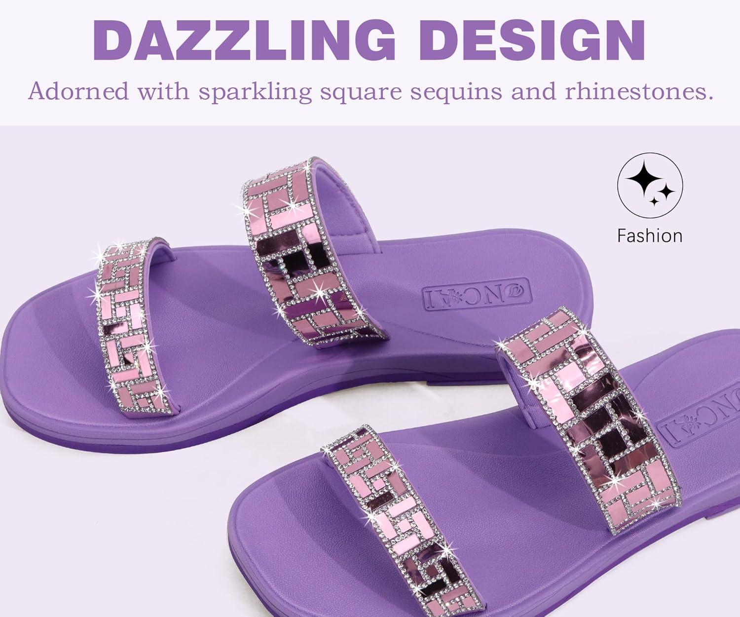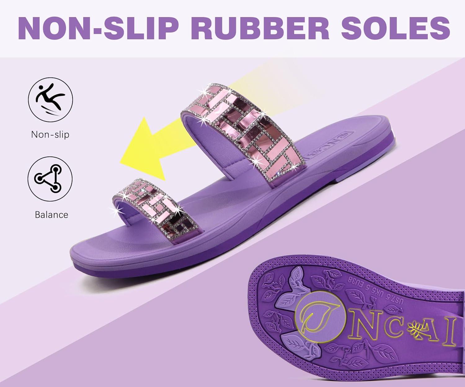 ONCAI Women’s Slide Sandals Trendy Square Summer Flat Dressy Sandals for Women 2025 Cross Strappy Open Split-Toe Ring with Slip-on Rubber Soles(Sparkling Purple(run Small size Up))