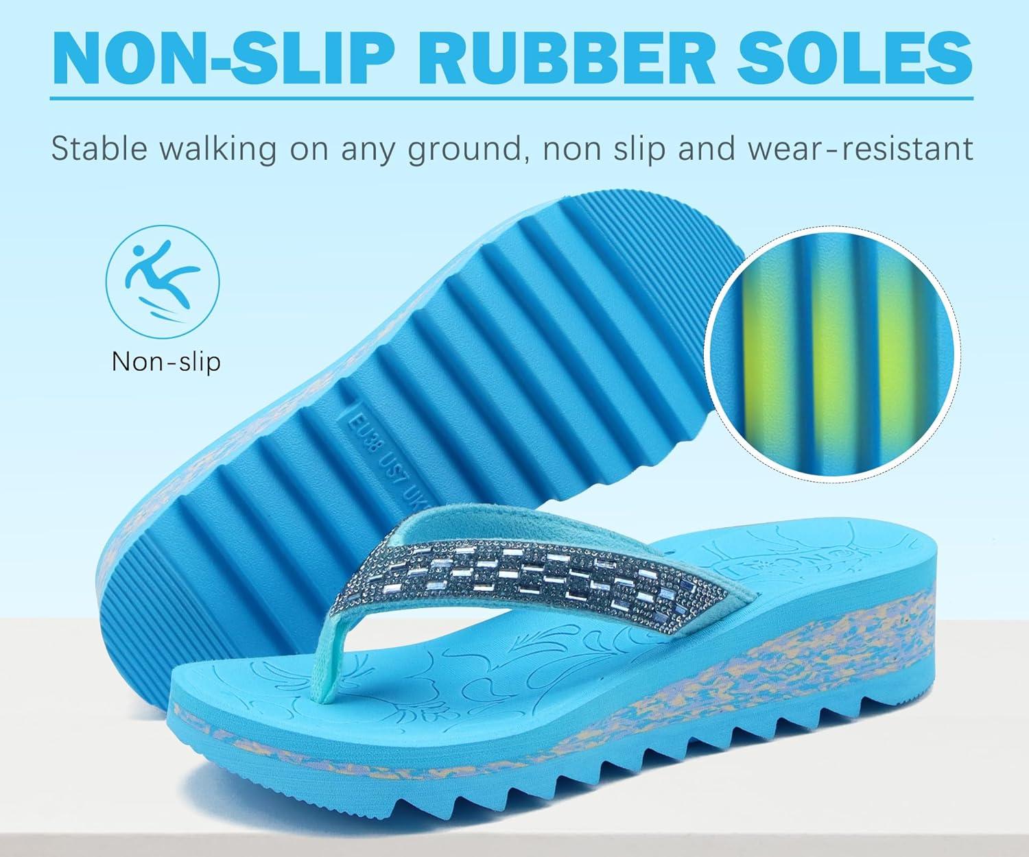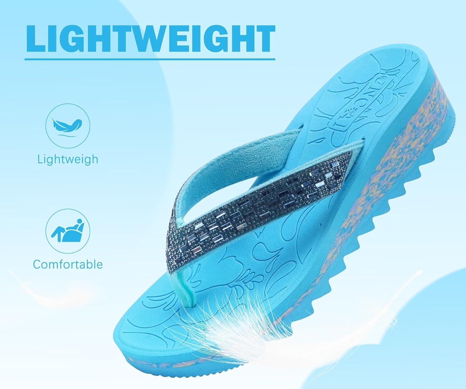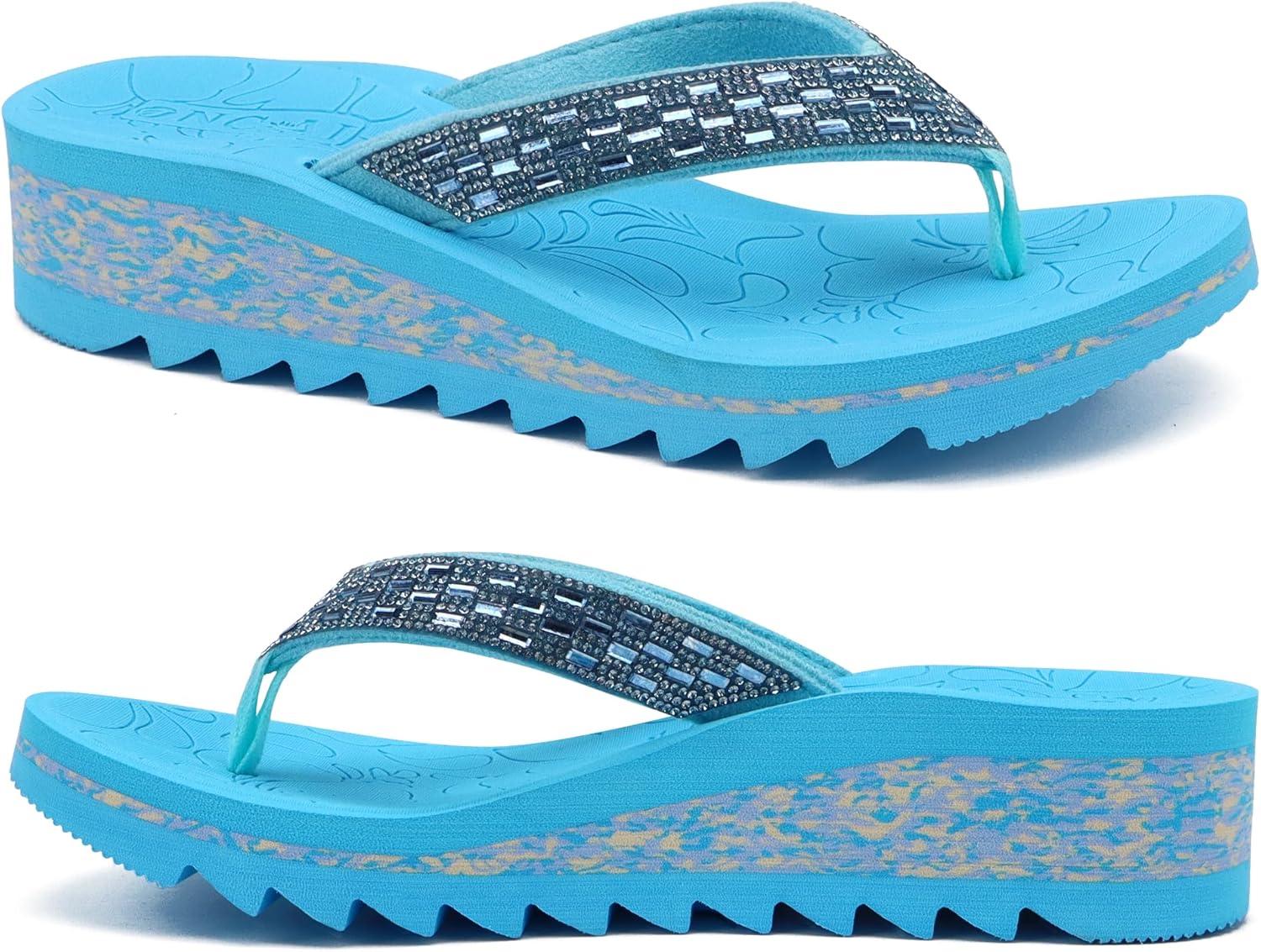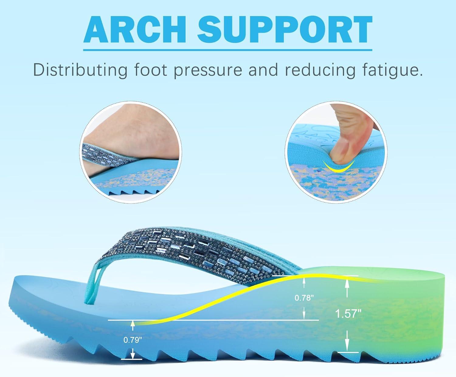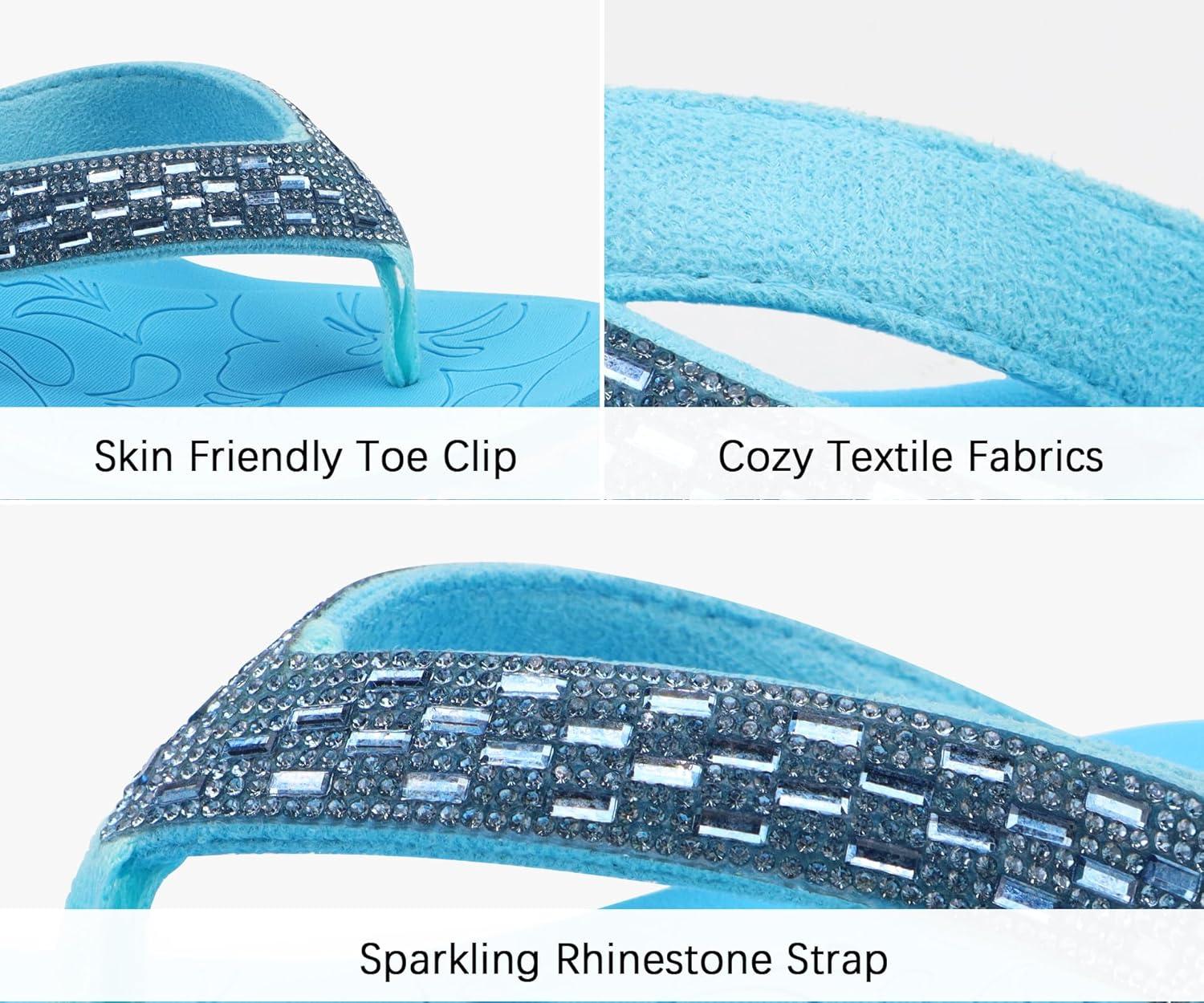 ONCAI Women’s Wedge Flip Flops with Rhinestone,Recovery Dressy Walking Sandals for Women with Comfortable Arch Support Cushion Yoga Mat Summer Rubber Soles(US Size 5-11)(Sky Blue)